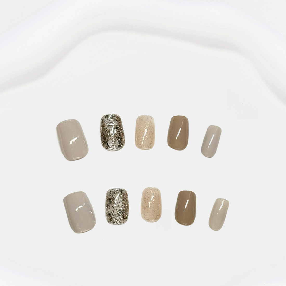 This press-on nail set features earthy tones paired with glitter and matte textures, creating a...