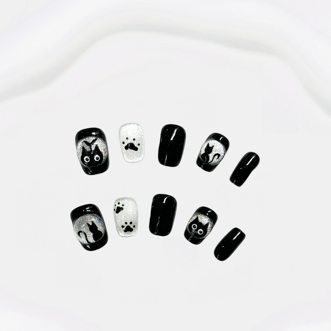This press-on nail set features a classic black and white palette with cat silhouettes and...