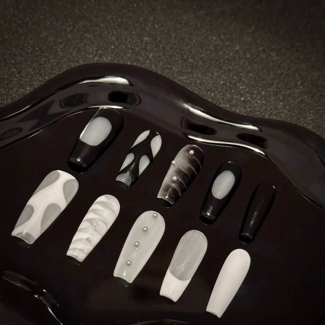 A sophisticated blend of black, white, and mix tones, this press-on nail set offers a...