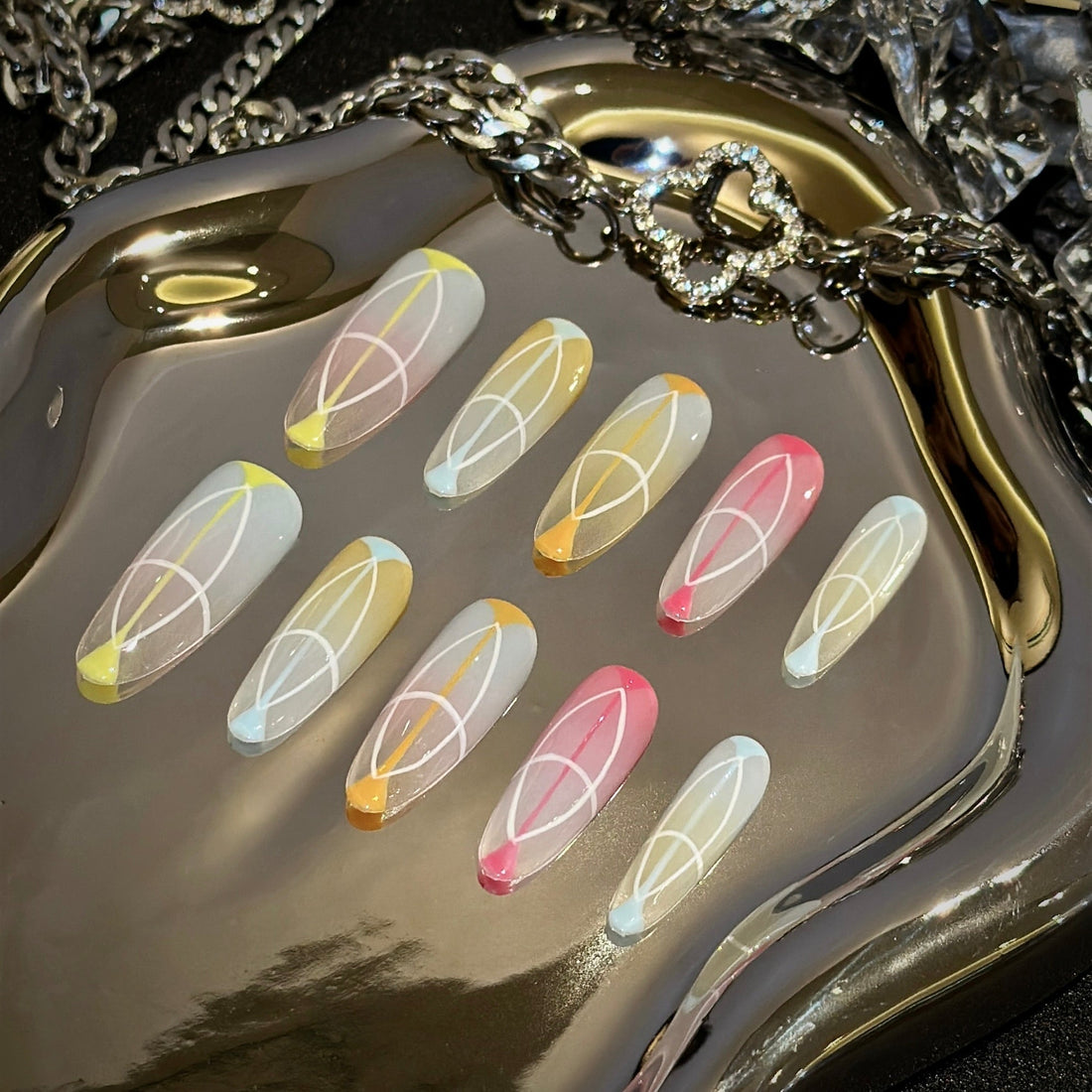 Ethereal Glow nails combine soft pastel gradients with clean white geometric patterns, exuding modern elegance...