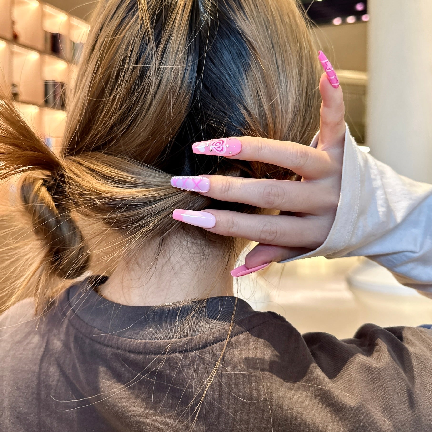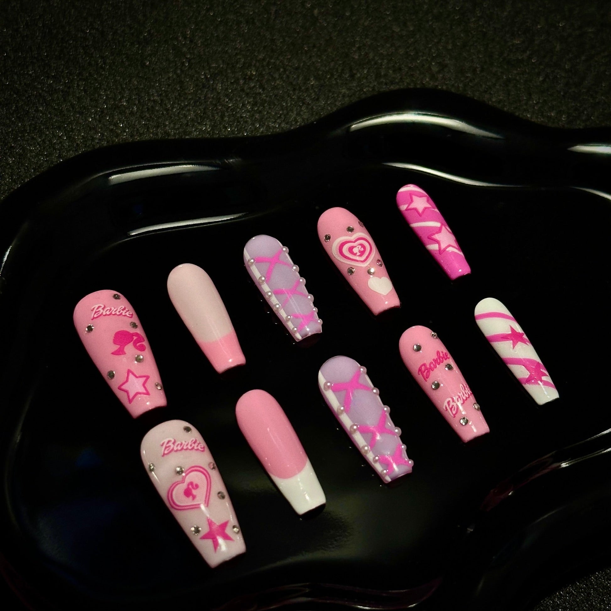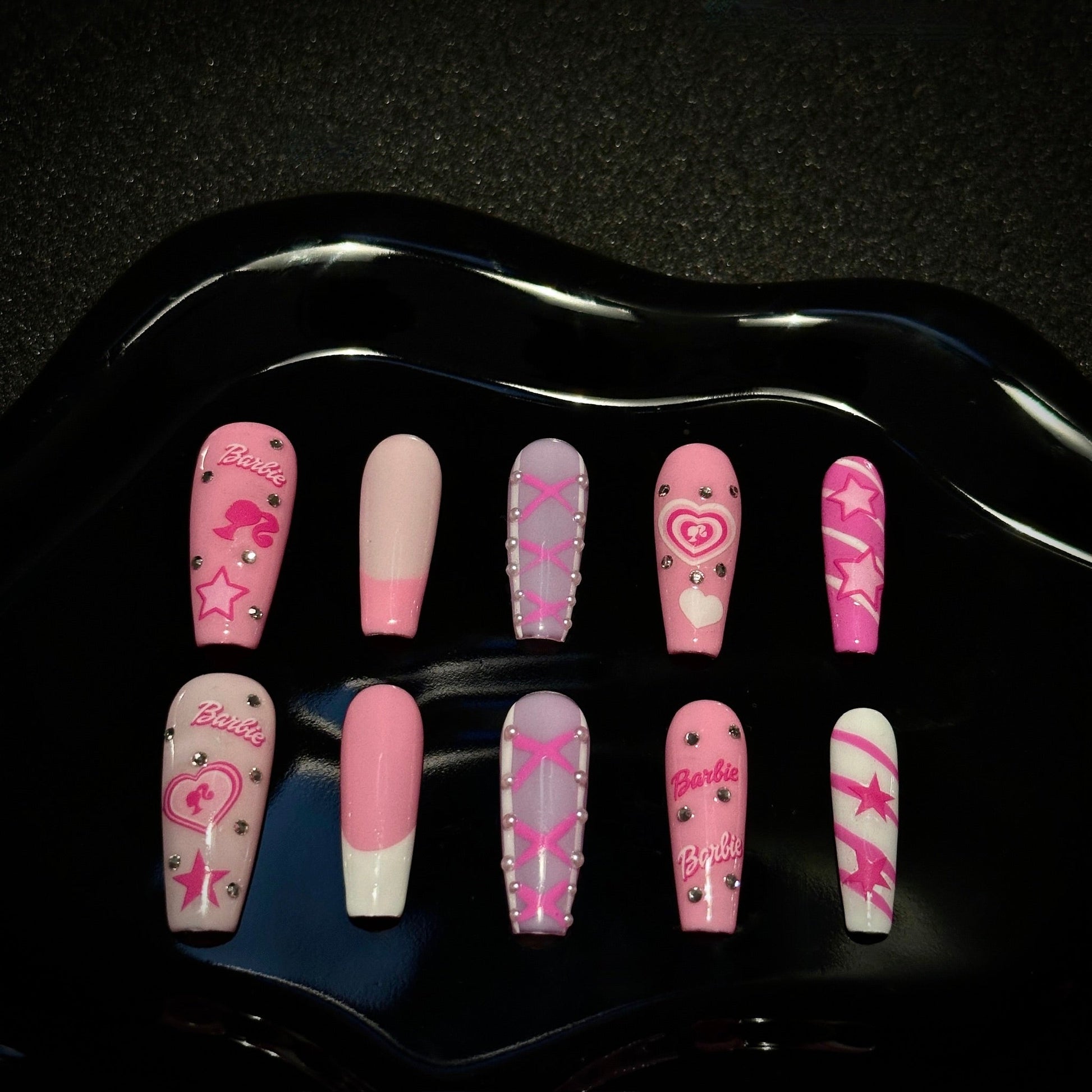 Step into the Barbie world with this vibrant pink nail set featuring playful designs, including hearts, stars, and iconic Barbie motifs. Perfect for adding a touch of nostalgia and fun to your look, these nails make every day feel like a glamorous adventure.