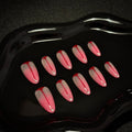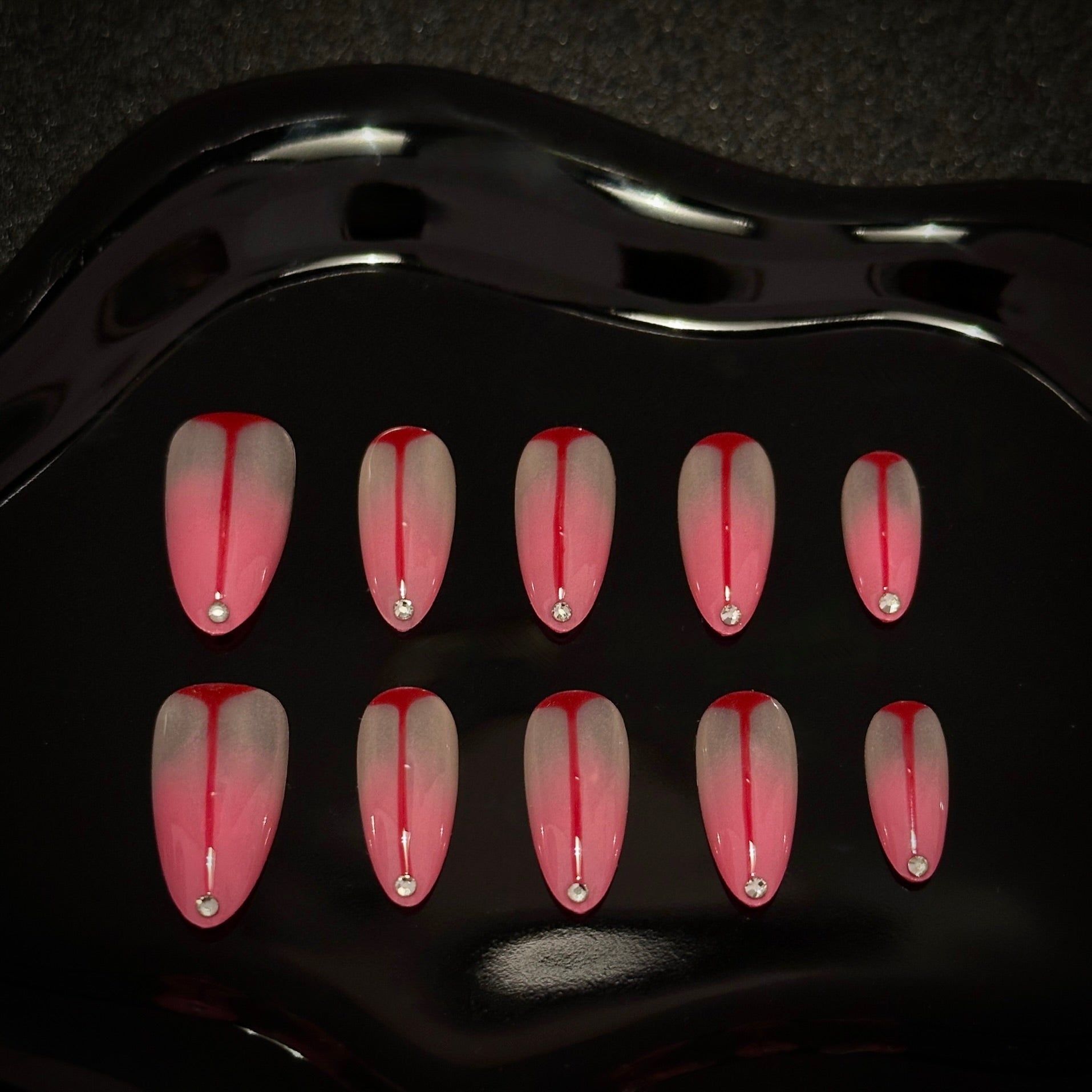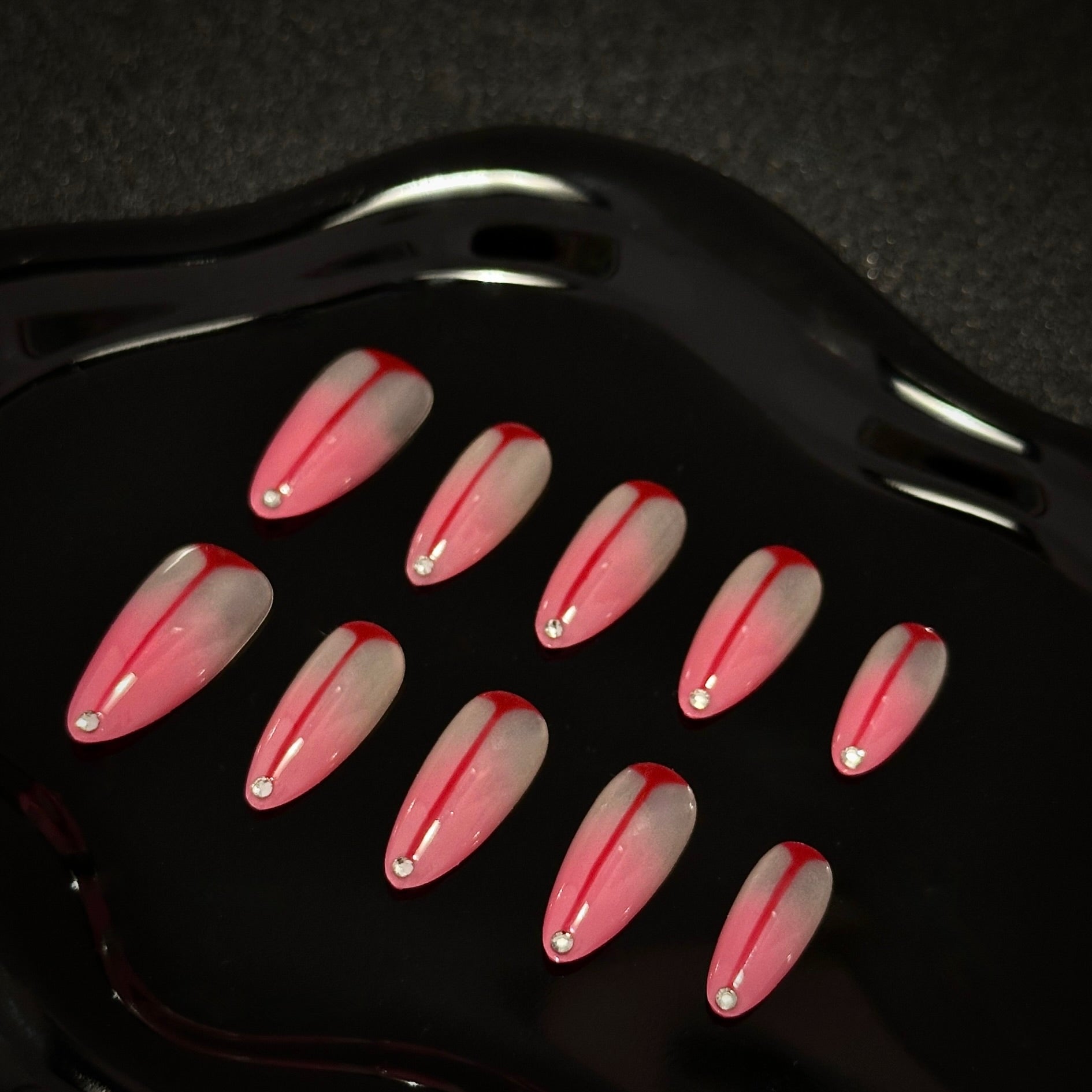 Inspired by the delicate hues of a blushing cheek, this press-on nail set features a graceful gradient of soft pink to bold red, adorned with shimmering rhinestones for a touch of elegance. Perfect for romantic evenings or a gentle pop of color in your daily look.