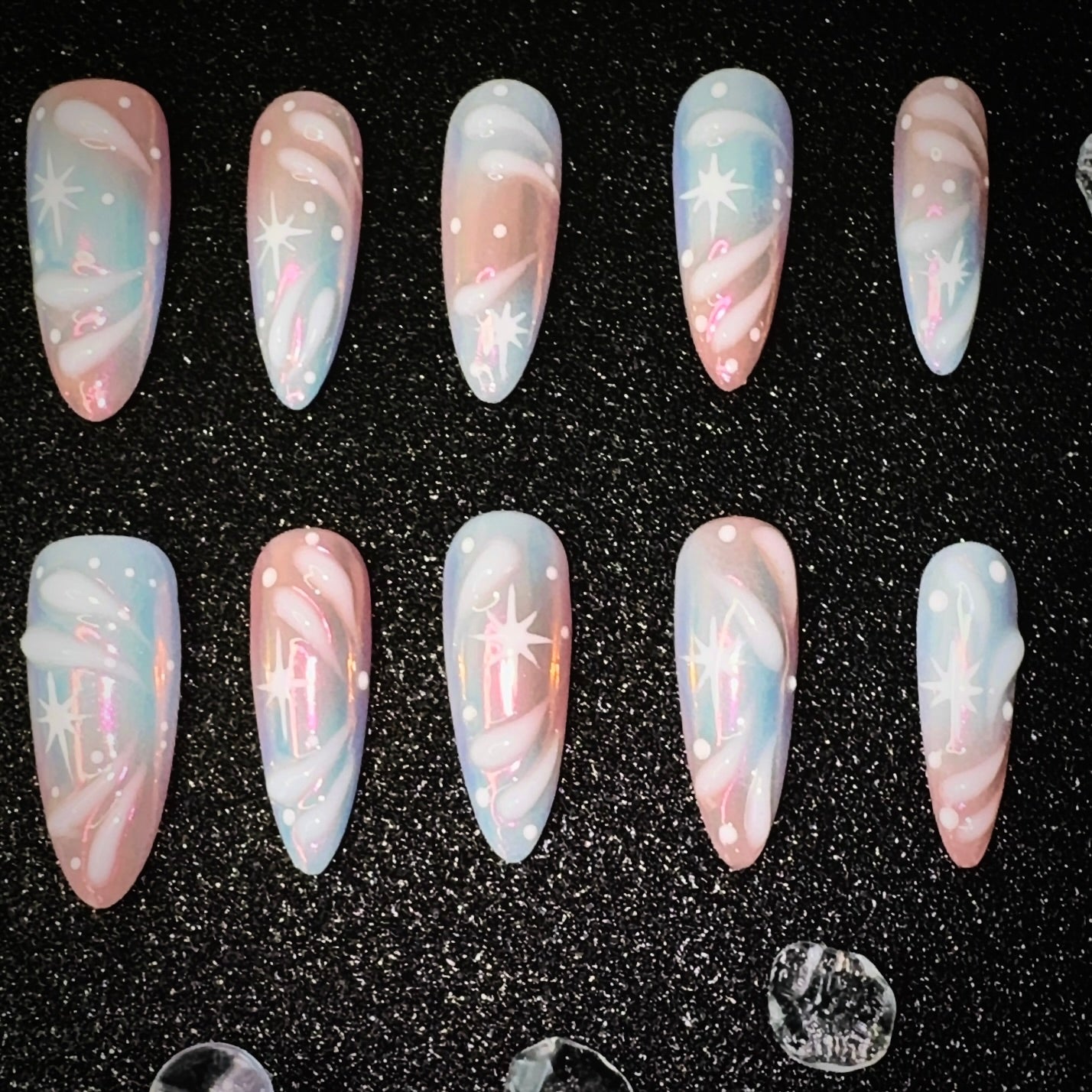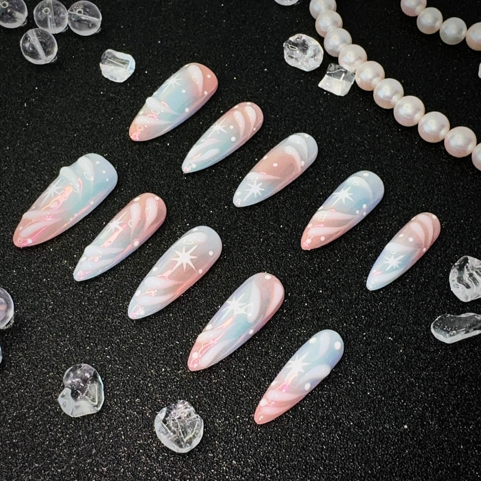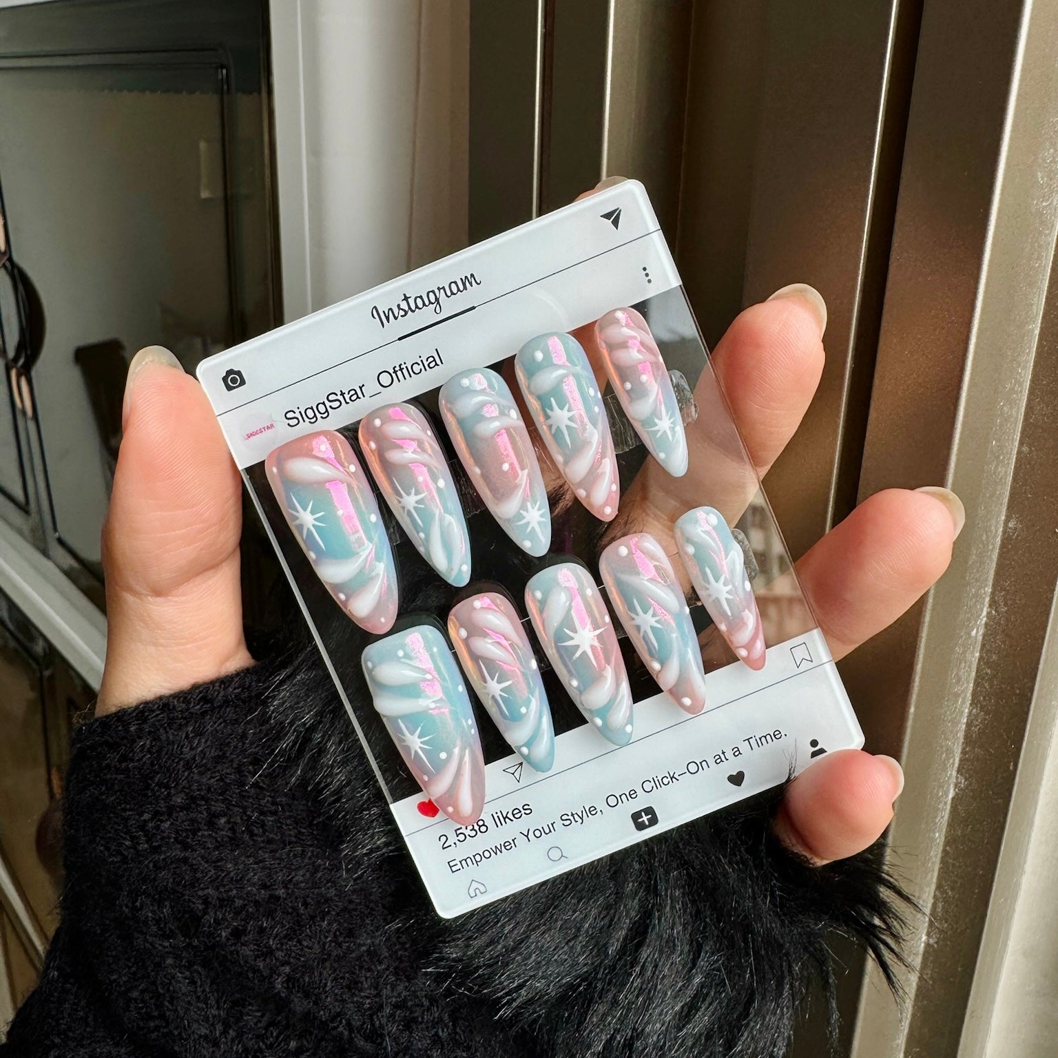 Transport yourself to a galaxy of wonder with our Celestial Dreams Nail Art Set! This stunning collection features a dreamy blend of soft pinks and ethereal blues, reminiscent of a sparkling starry sky. Adorned with whimsical swirls and shimmering star motifs, each nail captures the enchanting essence of the cosmos. Perfect for cosmic-themed events or adding a touch of magic to your everyday look, these press-on nails are easy to apply, allowing you to shine like the stars.