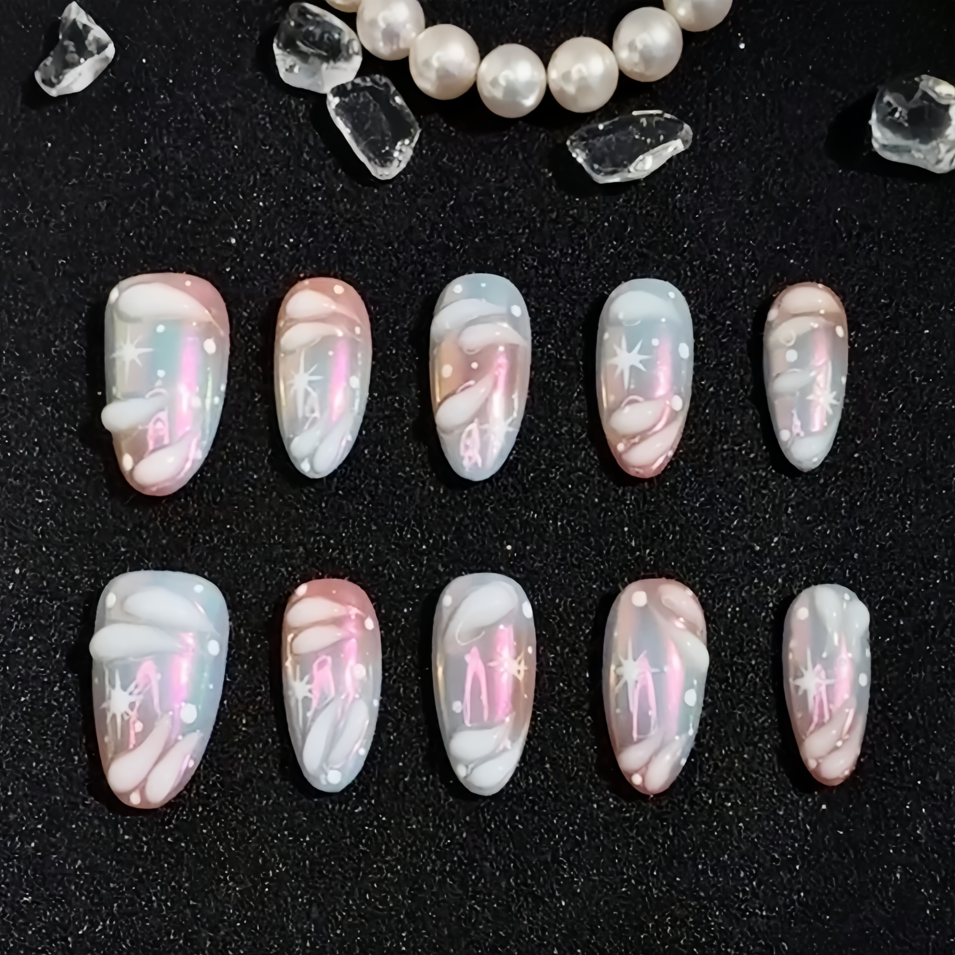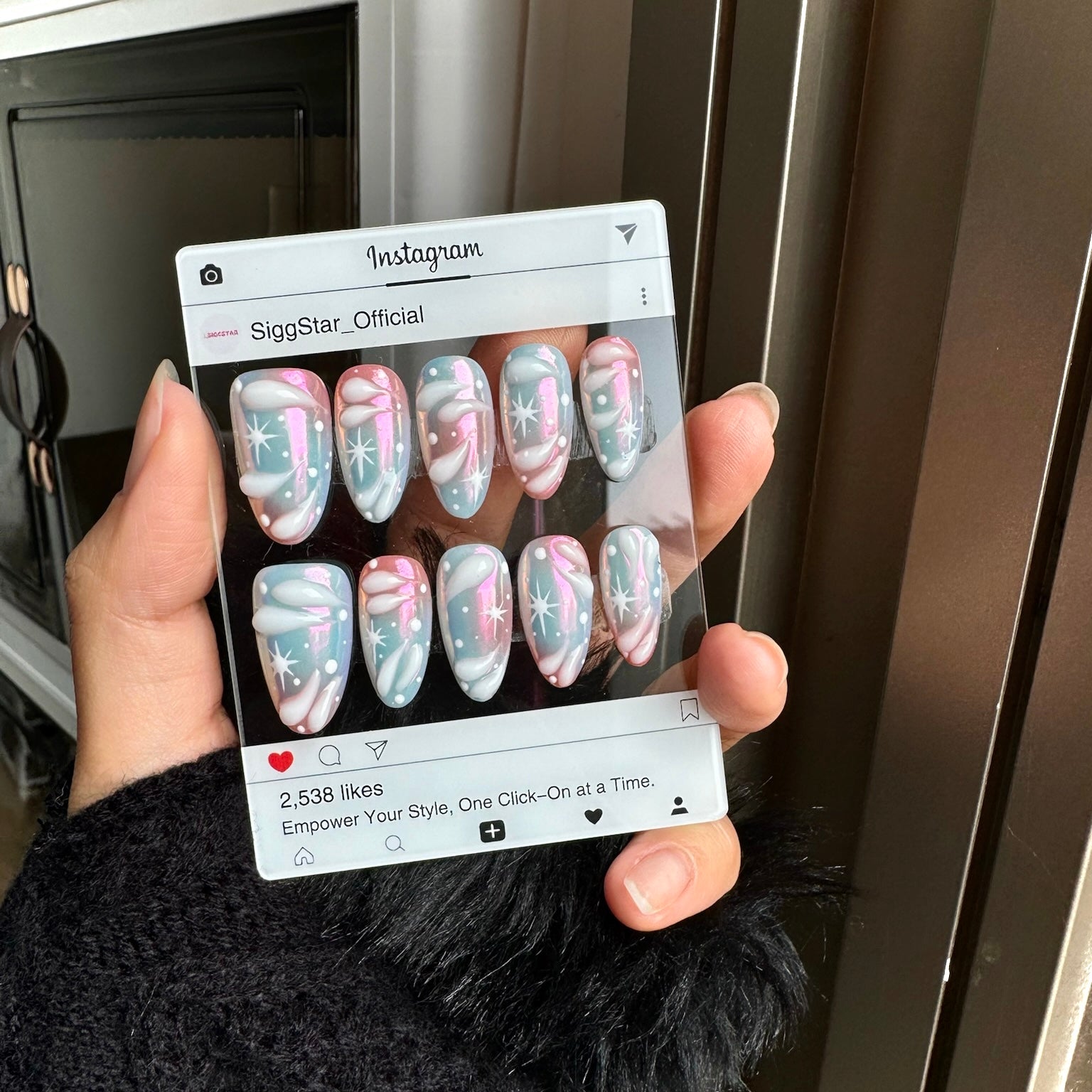 Transport yourself to a galaxy of wonder with our Celestial Dreams Nail Art Set! This stunning collection features a dreamy blend of soft pinks and ethereal blues, reminiscent of a sparkling starry sky. Adorned with whimsical swirls and shimmering star motifs, each nail captures the enchanting essence of the cosmos. Perfect for cosmic-themed events or adding a touch of magic to your everyday look, these press-on nails are easy to apply, allowing you to shine like the stars.