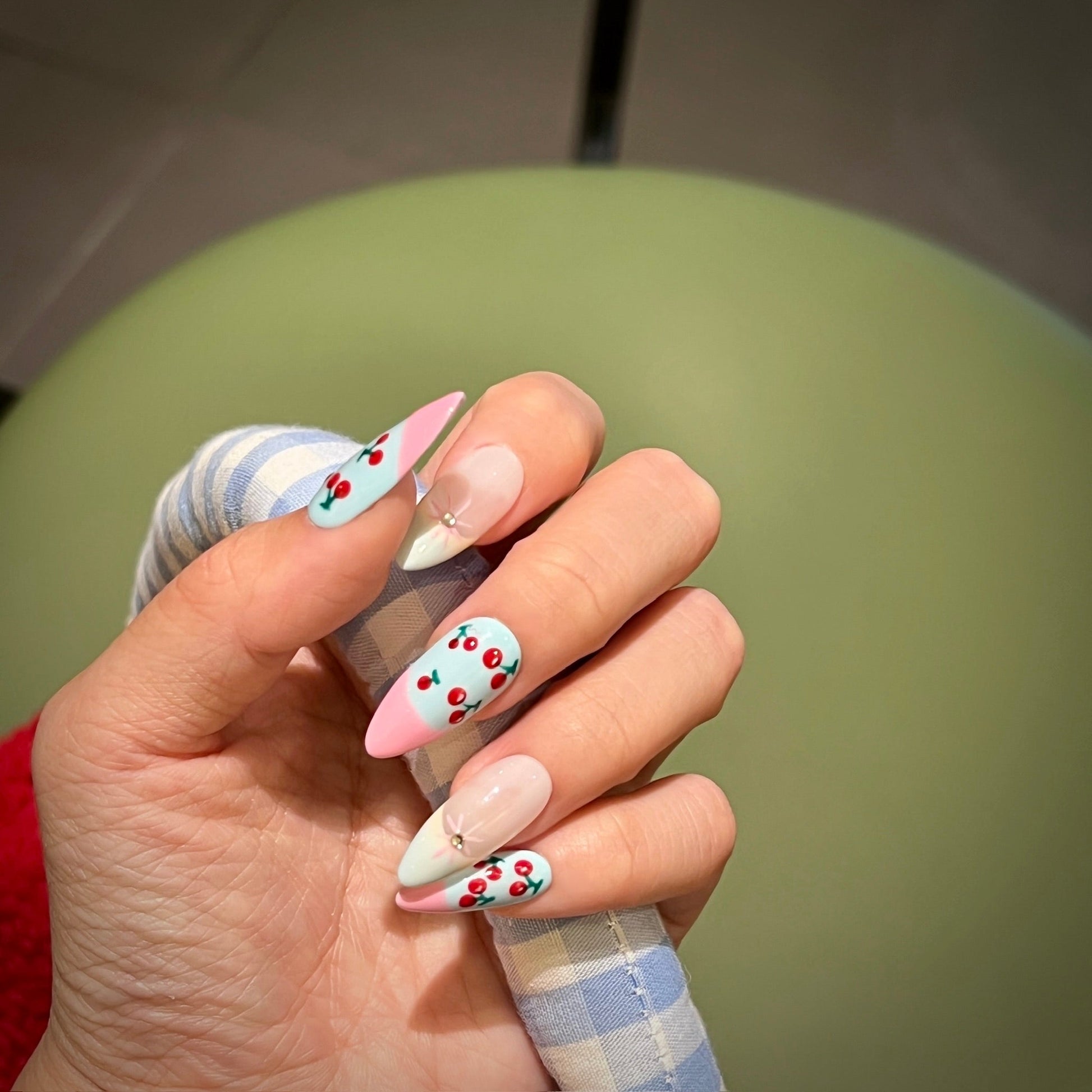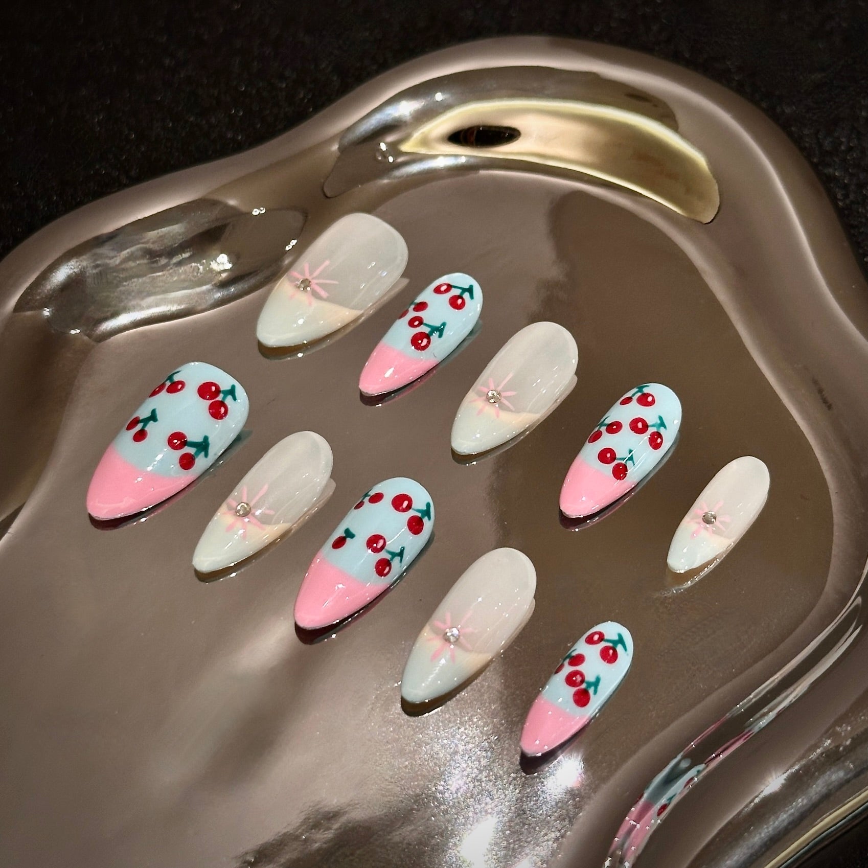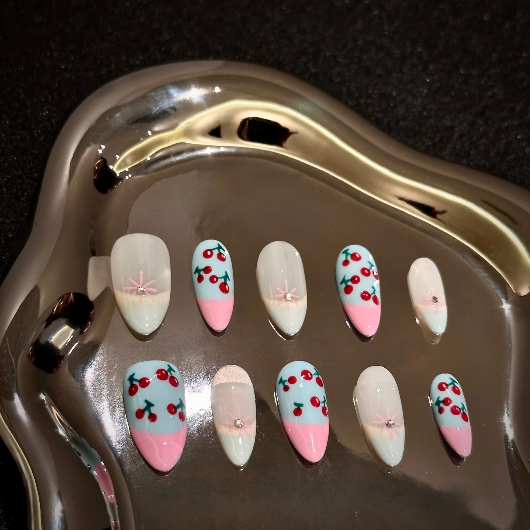 Add a touch of sweetness to your nails with Cherry Bliss press-on nails. Featuring playful cherry designs on pastel tones paired with pink accents and delicate rhinestones, these nails are the perfect blend of charm and elegance.