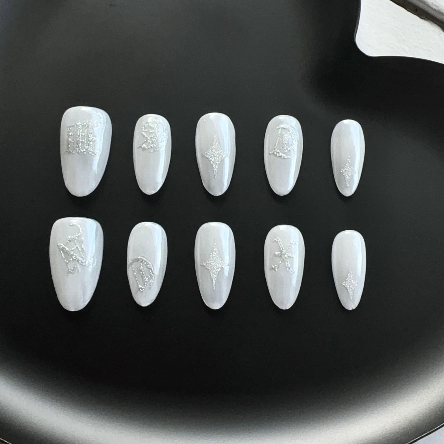 Illuminate your style with our Cosmic Glow Nail Art Set! This stunning collection features a chic light gray base adorned with radiant silver accents, capturing the essence of a celestial night sky. Each nail showcases unique cosmic designs, including stars and mystical symbols, perfect for adding a touch of elegance and intrigue to any look. Whether for a special occasion or to elevate your everyday style, these easy-to-apply press-on nails are a stellar choice!