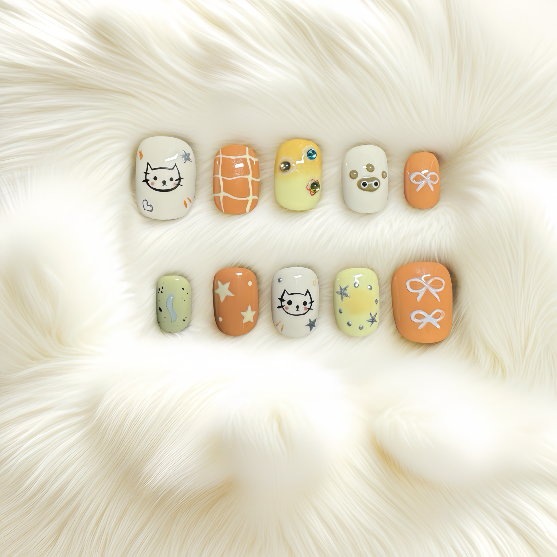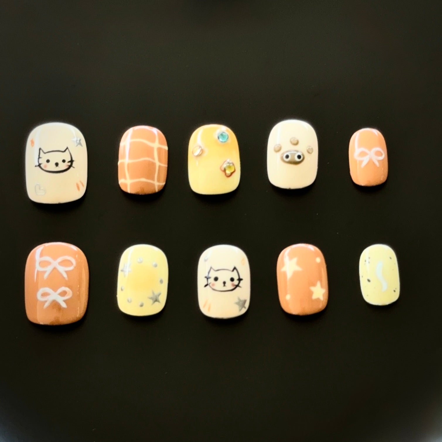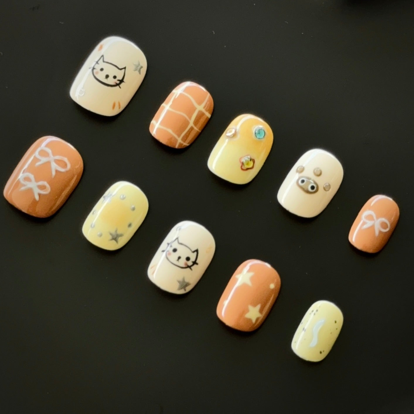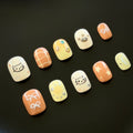Inspired by the cozy tones of autumn, this press-on nail set features adorable cat designs, paw prints, bows, and plaid patterns, blending playfulness with elegance. The warm caramel and cream hues evoke a comforting fall vibe, enhanced by sparkling stars and rhinestones. Perfect for everyday wear or special occasions, these eco-friendly, reusable nails embody sustainable style.