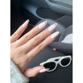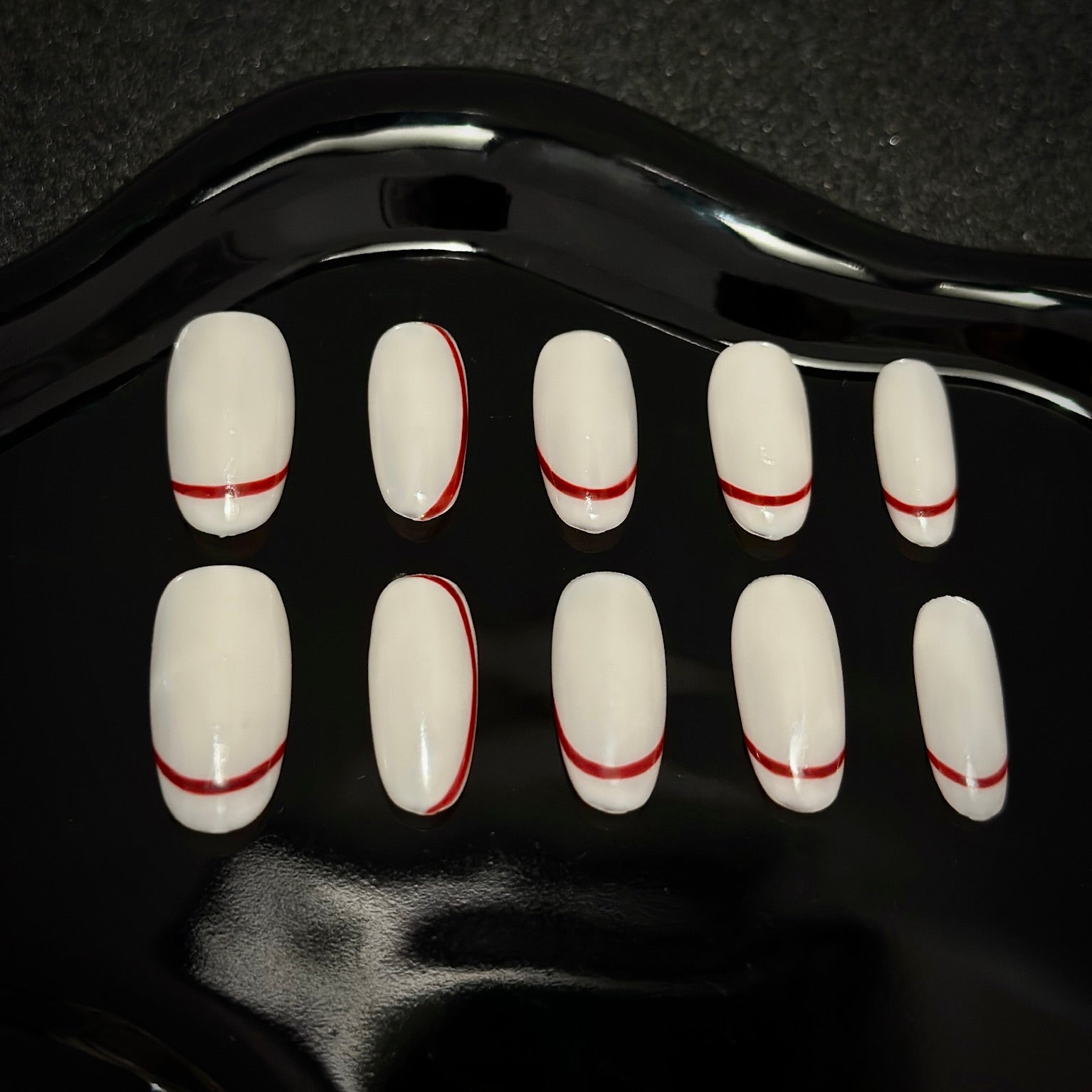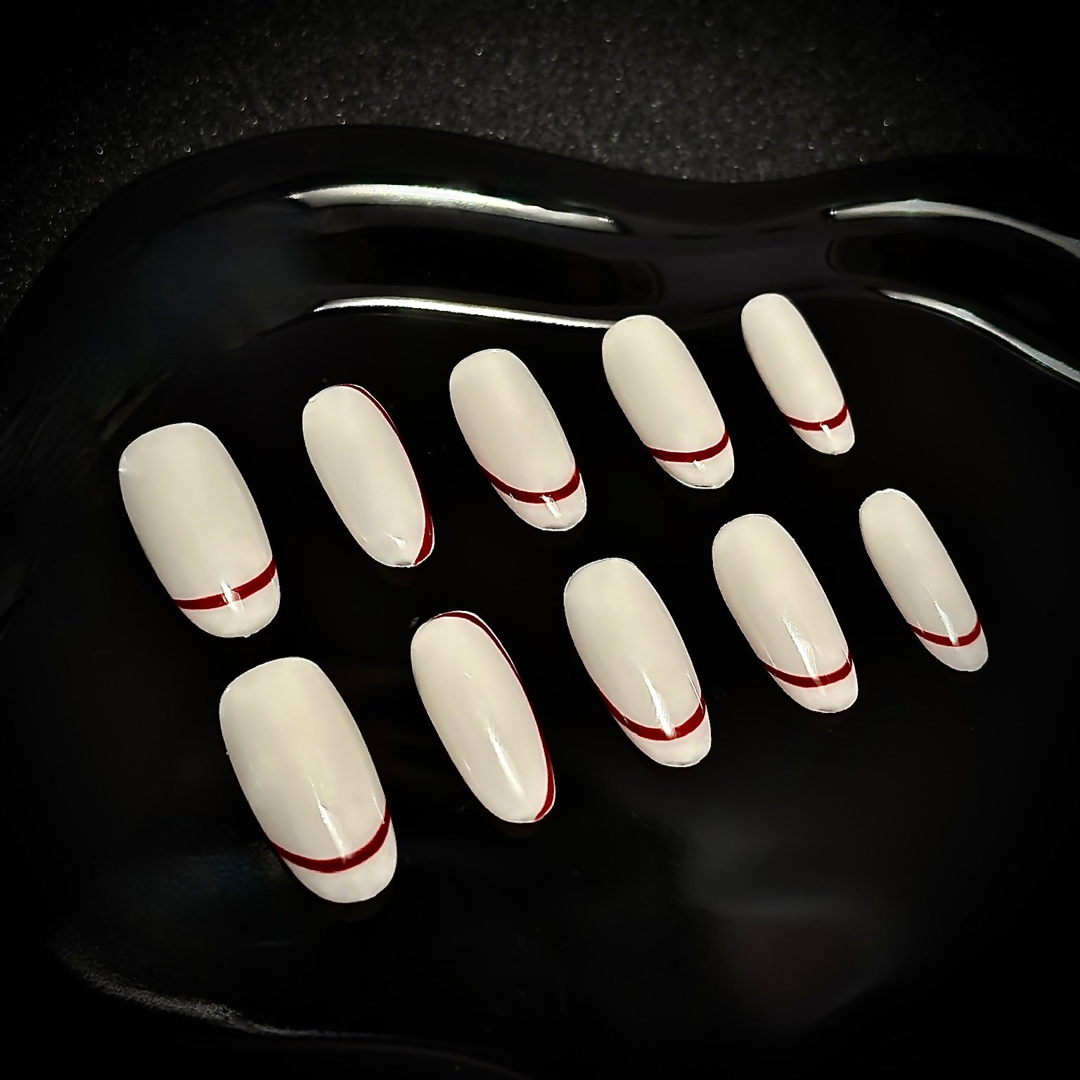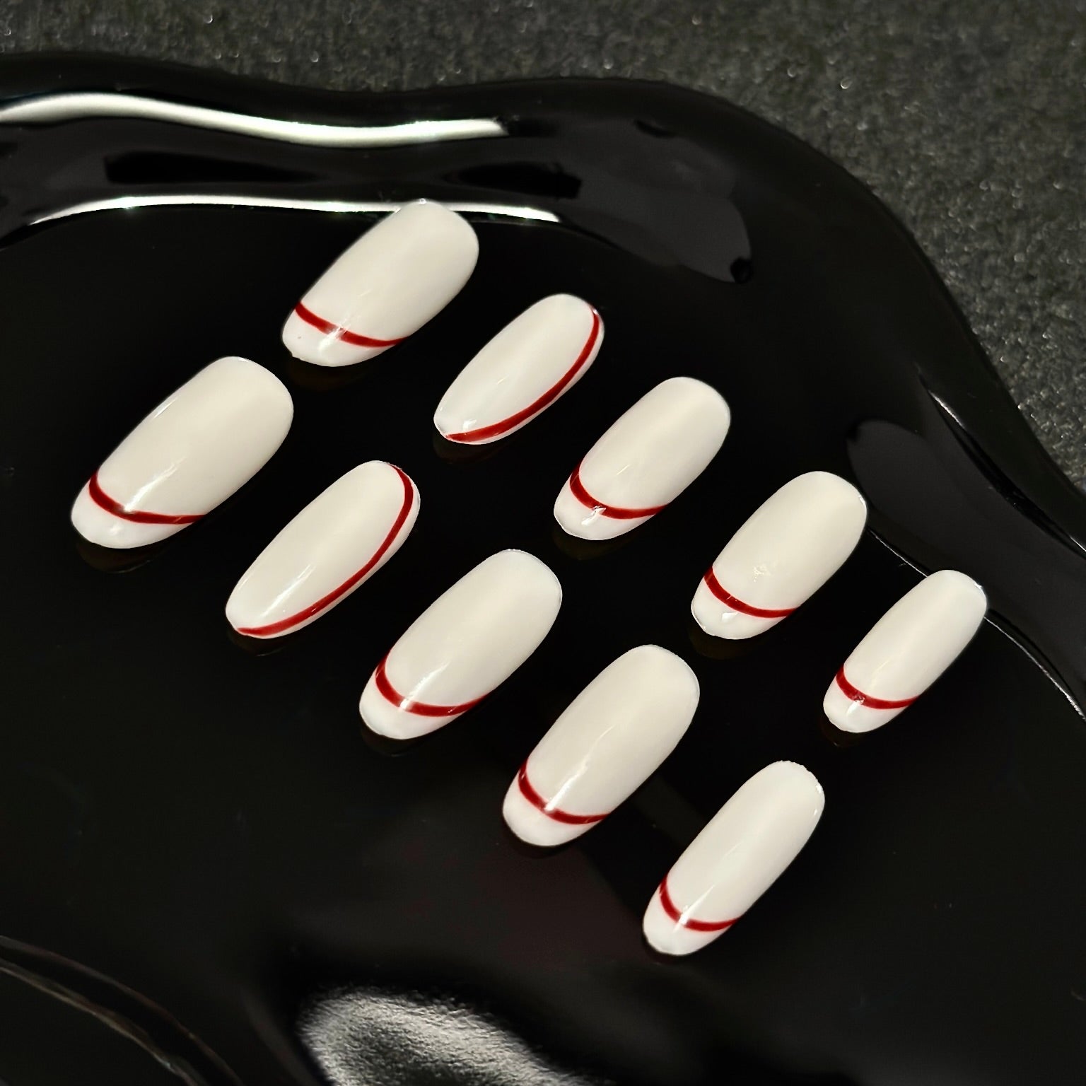 A modern twist on classic French tips. White nails with sleek red accents bring bold elegance to your style. Inspired by Kylie Jenner, these press-ons are perfect for a statement look with effortless wear.
