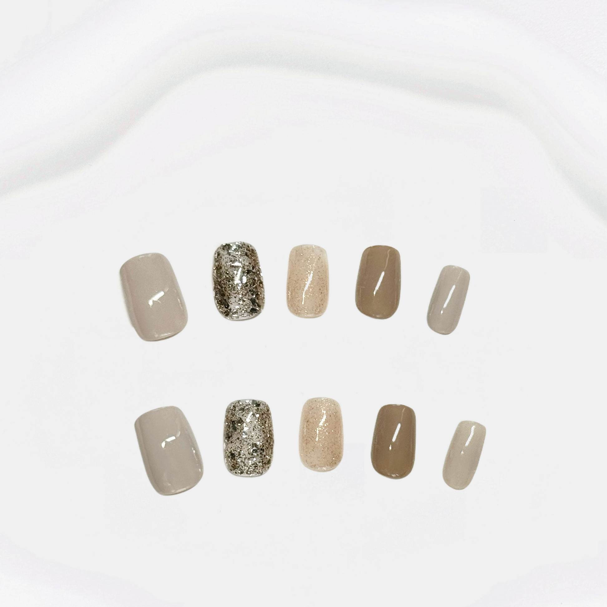 This press-on nail set features earthy tones paired with glitter and matte textures, creating a harmonious blend of natural elegance and luxury. The patchwork design adds depth and dimension to your fingertips, making it suitable for both everyday wear and special occasions. Crafted with eco-friendly, reusable materials, it embodies sustainable beauty.