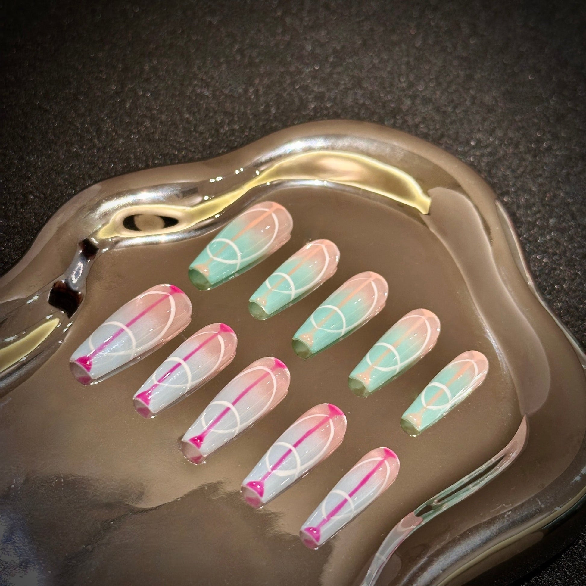 Ethereal Glow nails combine soft pastel gradients with clean white geometric patterns, exuding modern elegance and dreamy vibes. Perfect for those who love a subtle yet striking look, this set transitions seamlessly between casual and chic occasions.