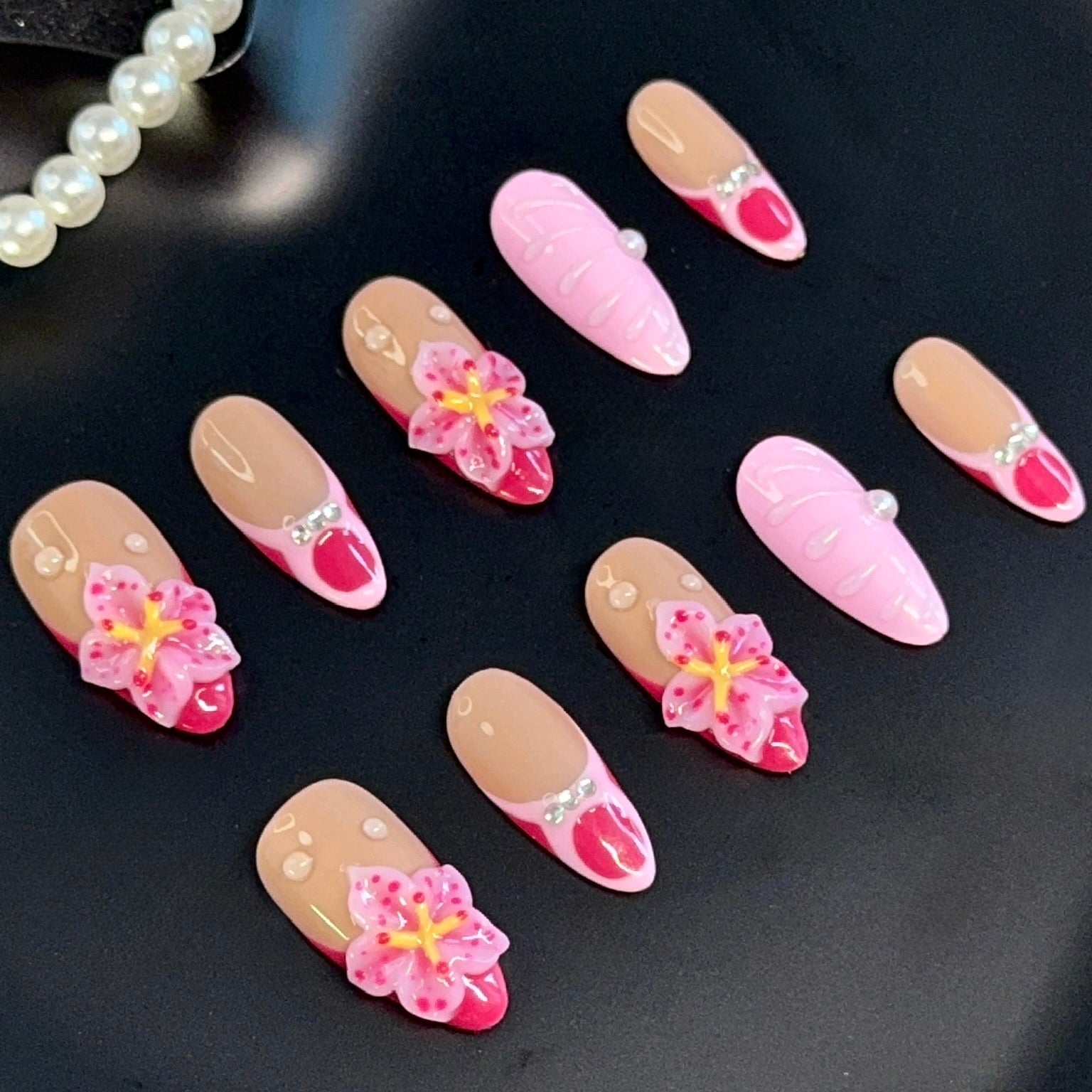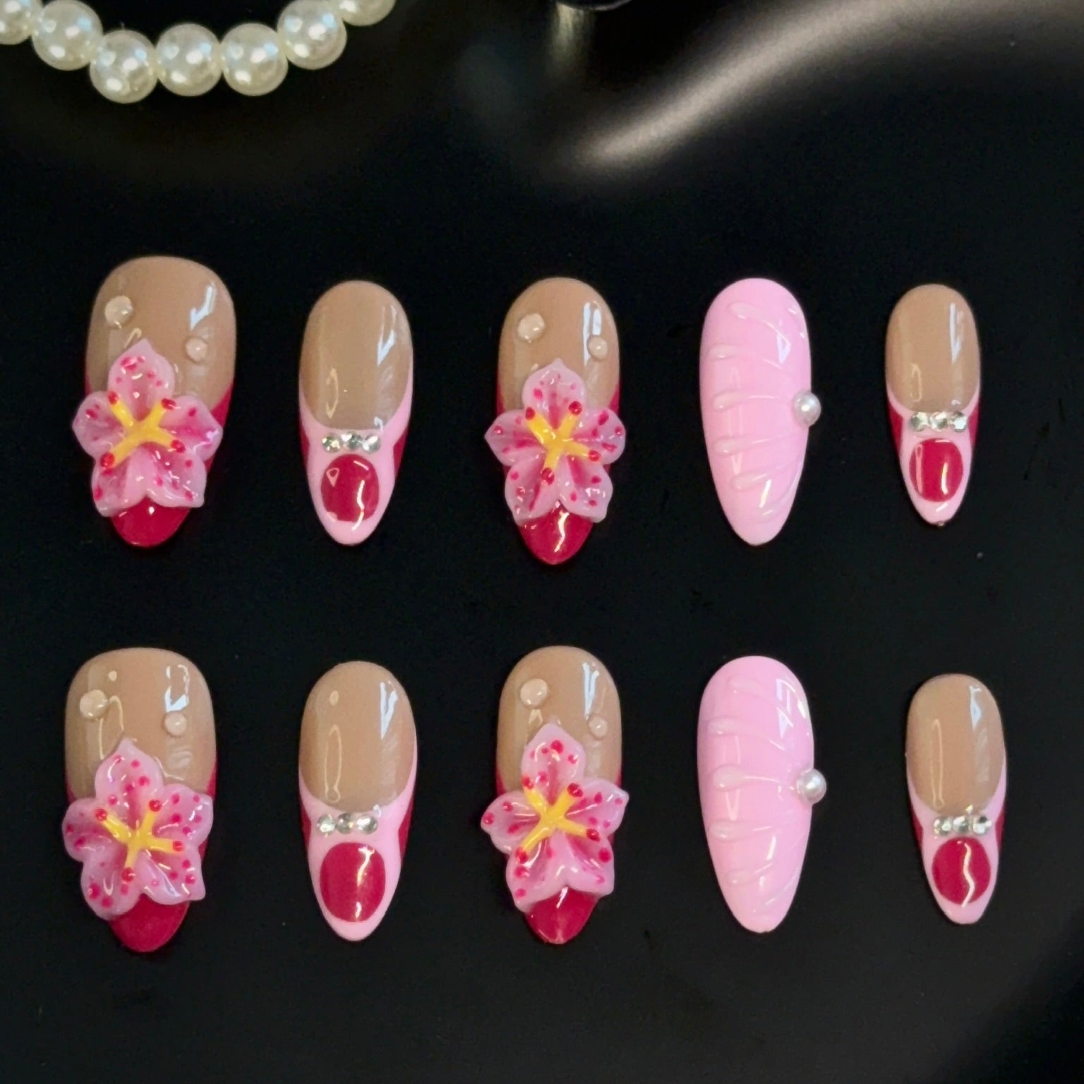 A harmonious blend of warm nude tones and bold red accents, this press-on nail set exudes elegance and sophistication. Featuring delicate hand-crafted 3D floral embellishments, pearl details, and dazzling rhinestone highlights, this design is perfect for those who love a refined yet striking manicure.