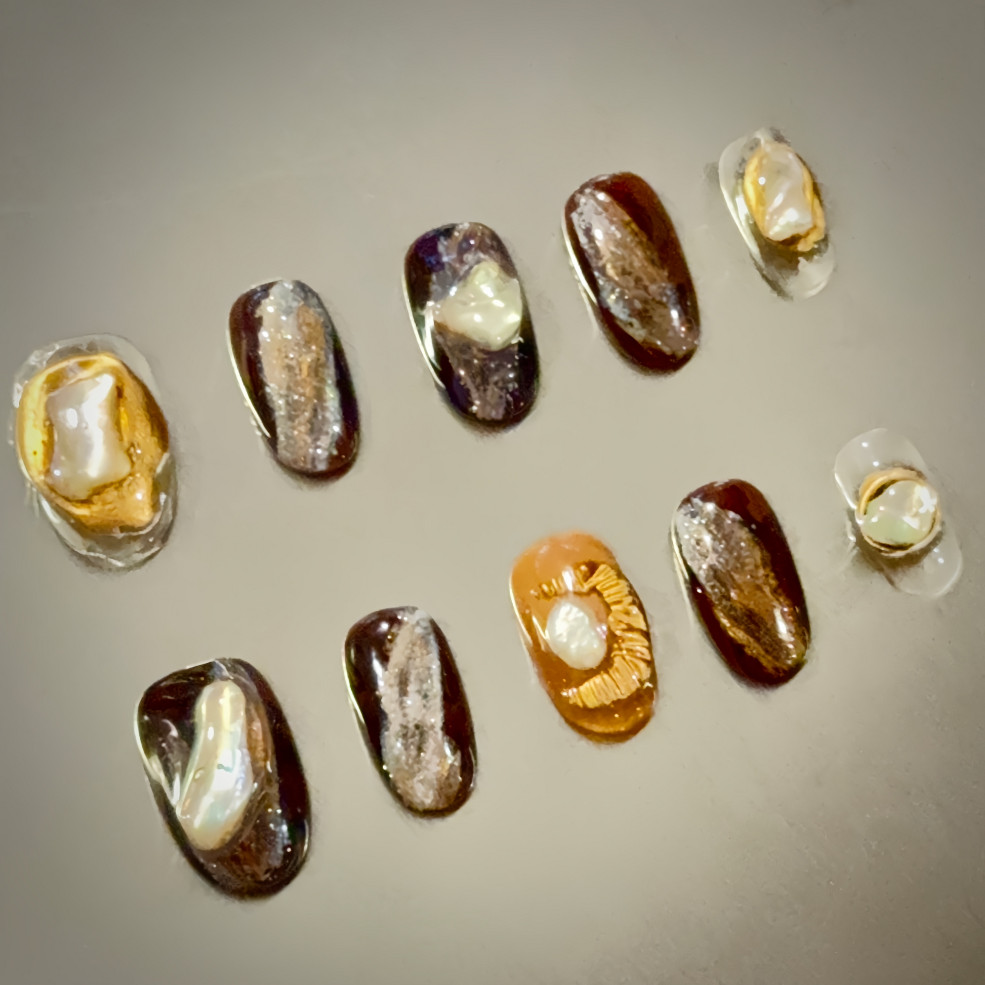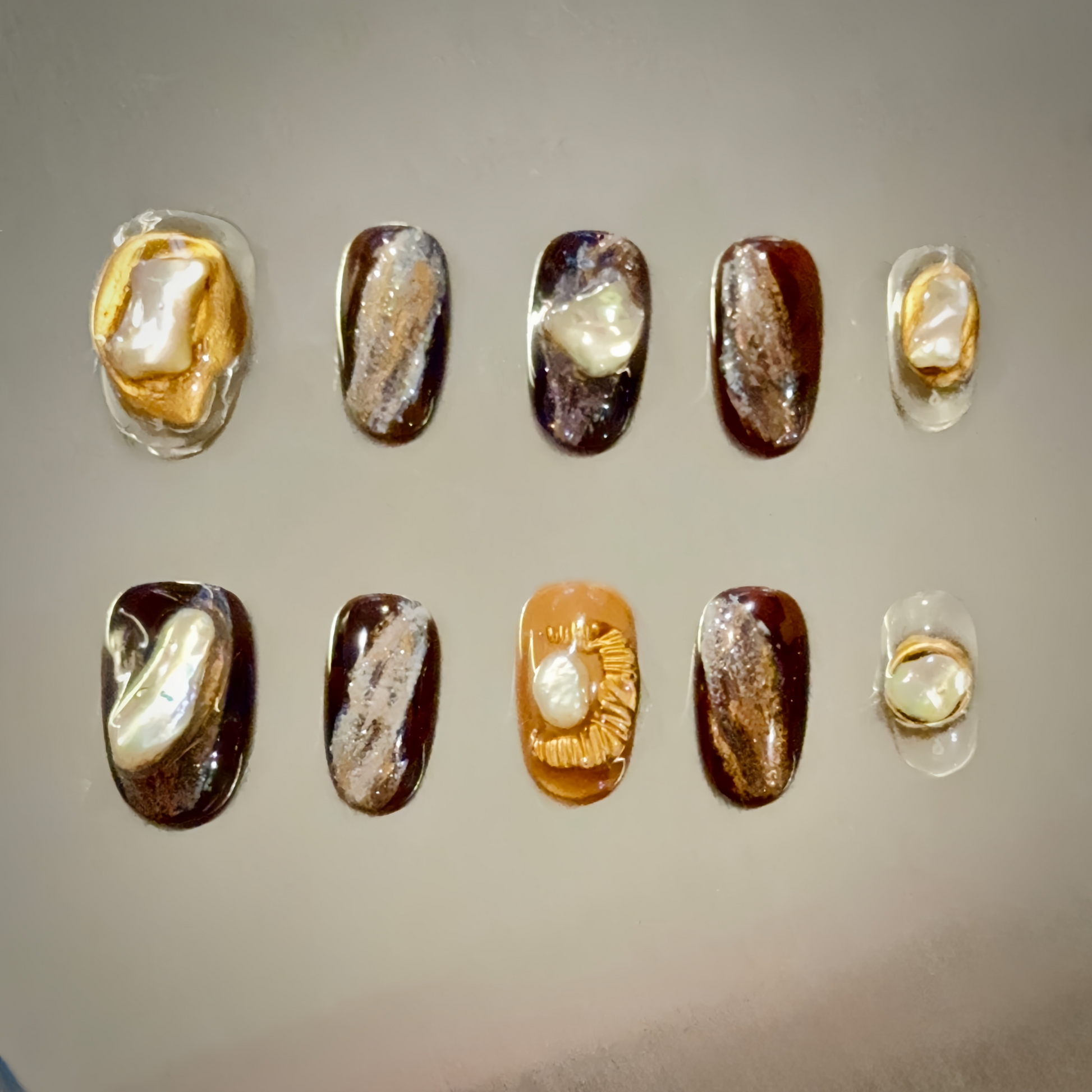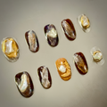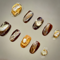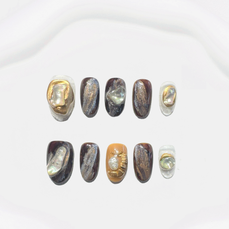 This stunning nail set perfectly blends luxury and artistry, featuring golden marble-inspired designs with 3D mother-of-pearl accents for an exquisite, jewel-like finish. The deep, rich base tones intertwine with shimmering gold details, creating a sophisticated and elegant aesthetic. Each piece is uniquely designed to exude a timeless, refined charm.