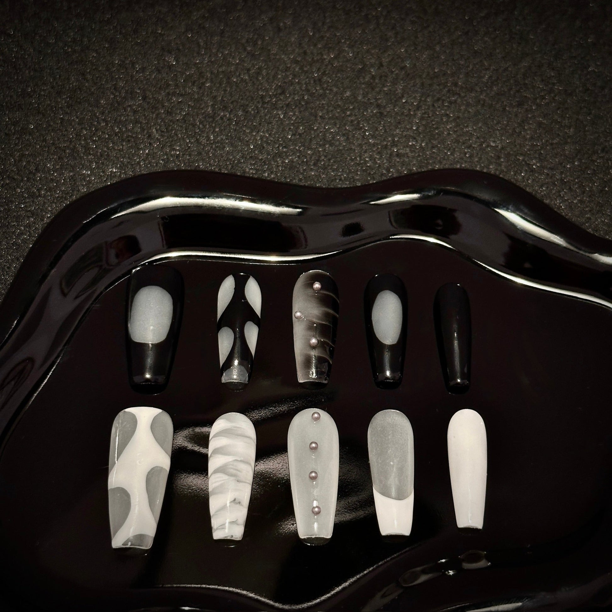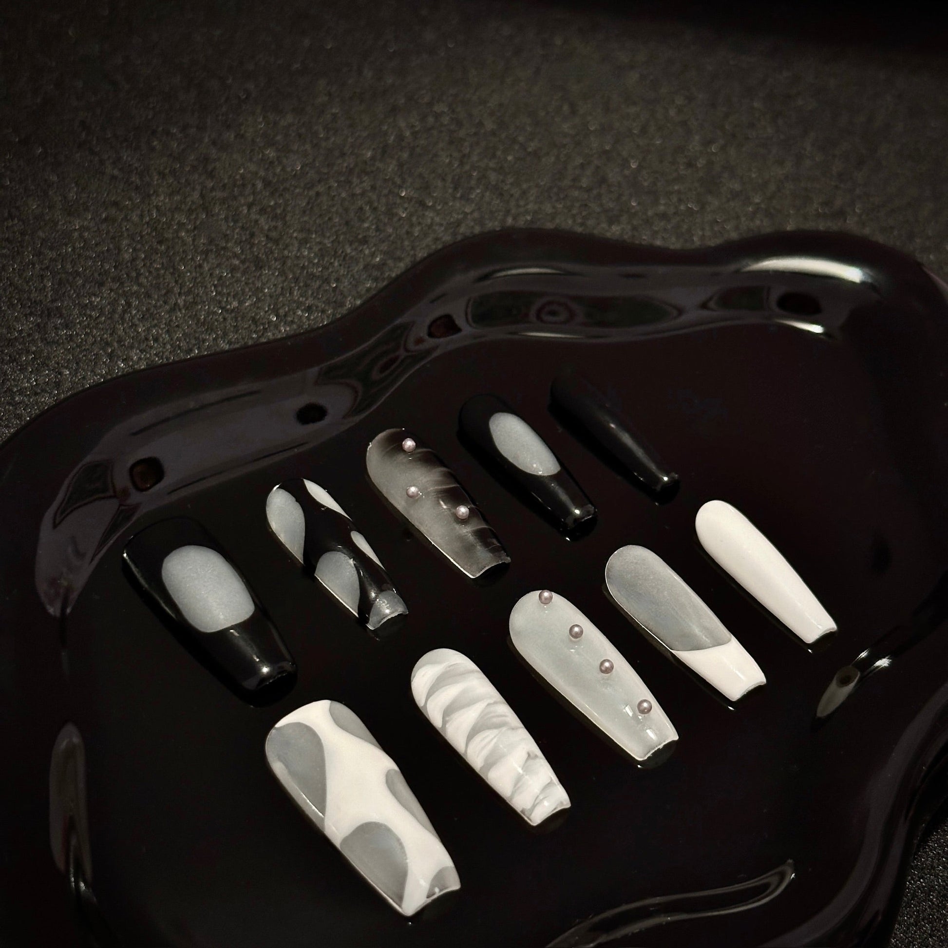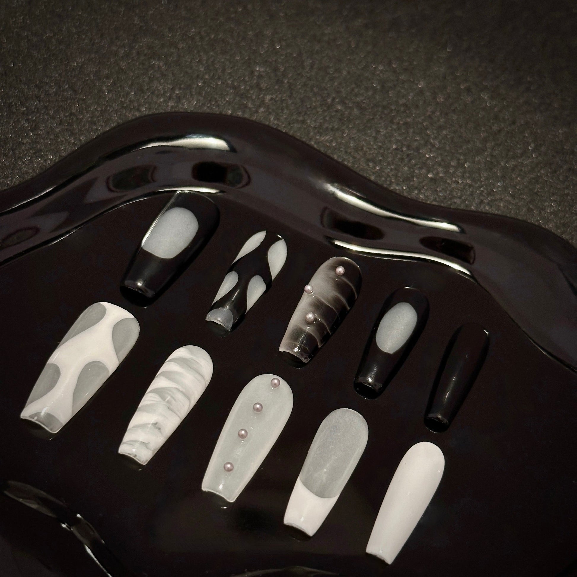 A sophisticated blend of black, white, and mix tones, this press-on nail set offers a modern take on elegance. Featuring marble swirls, sleek patterns, and pearl embellishments, these nails are perfect for making a bold yet refined statement.