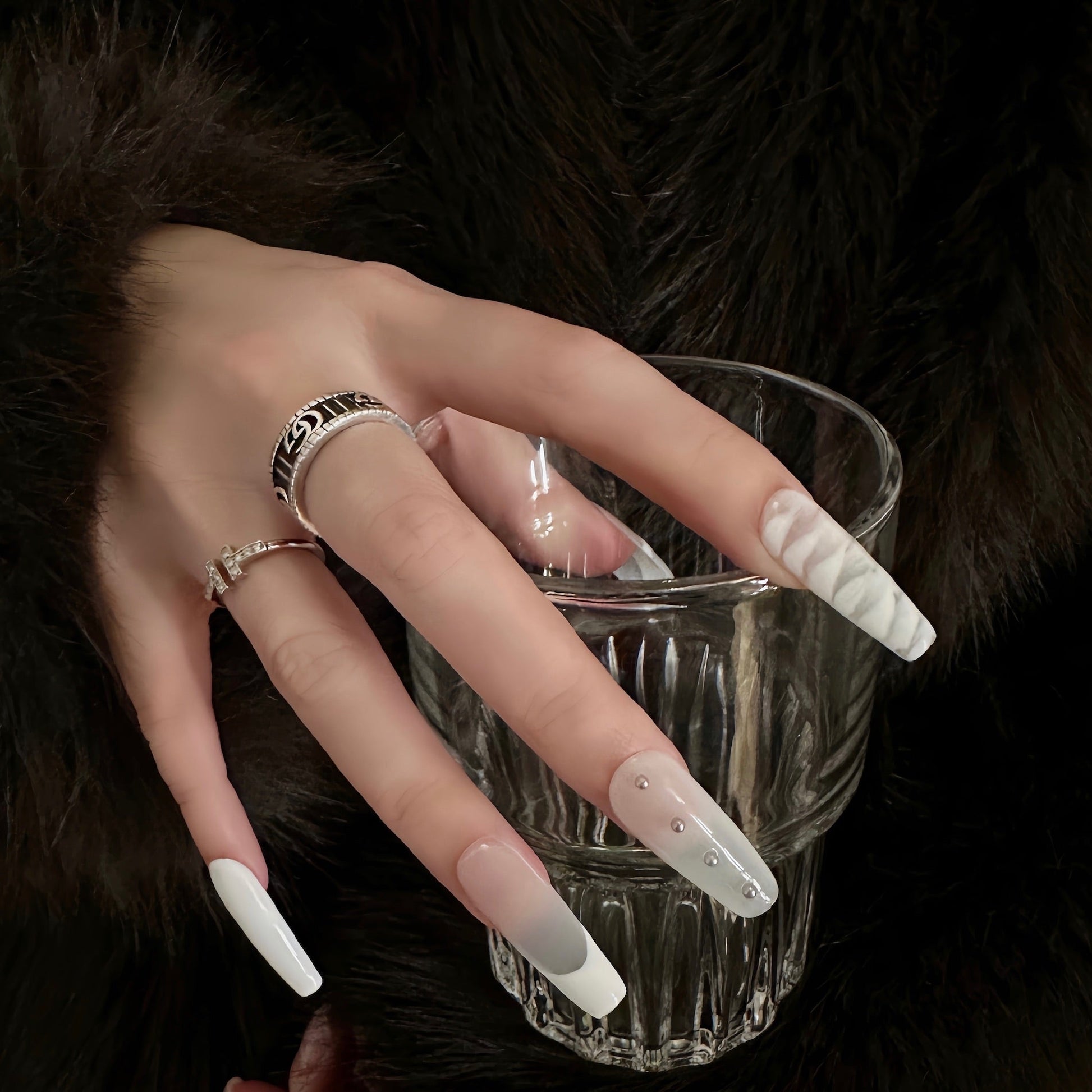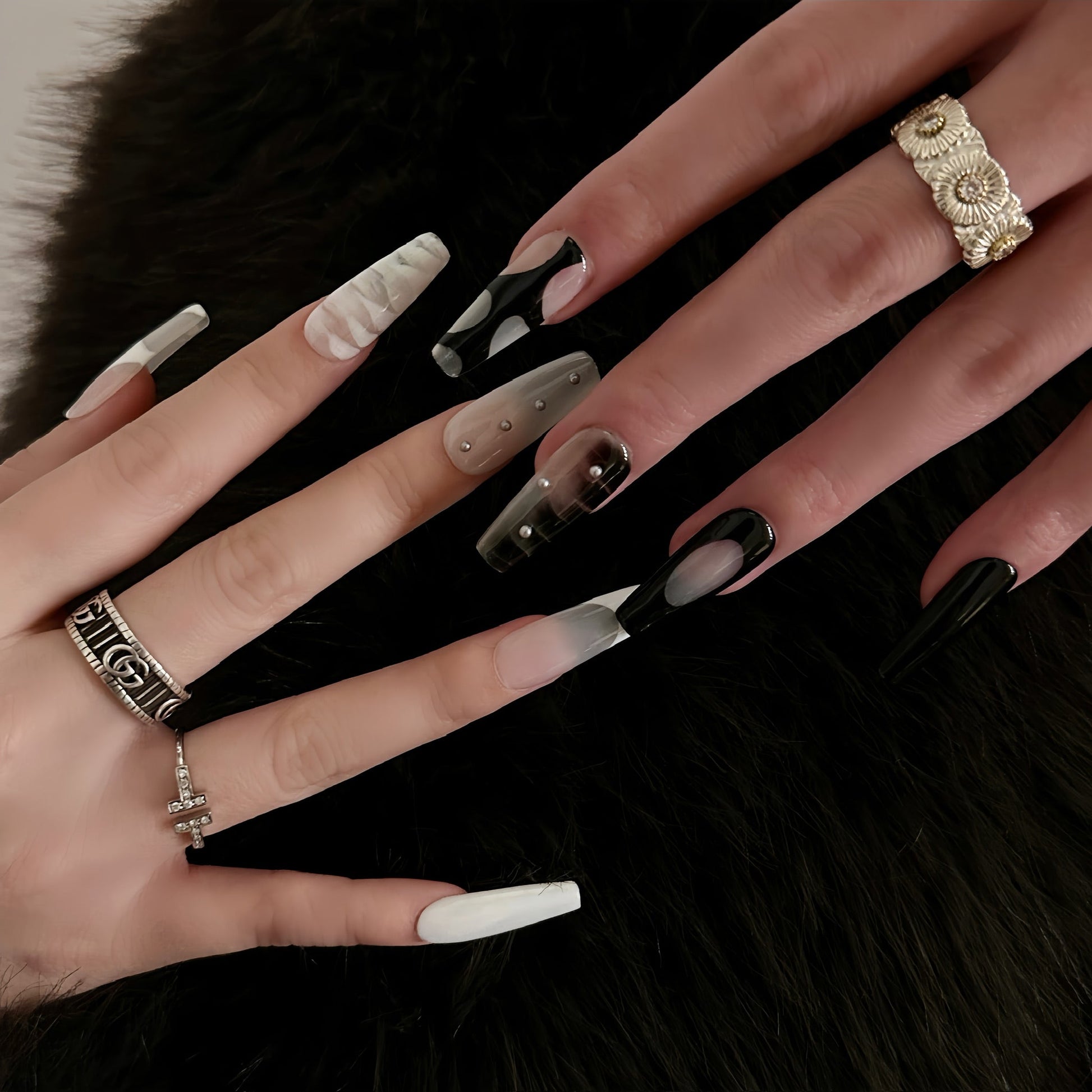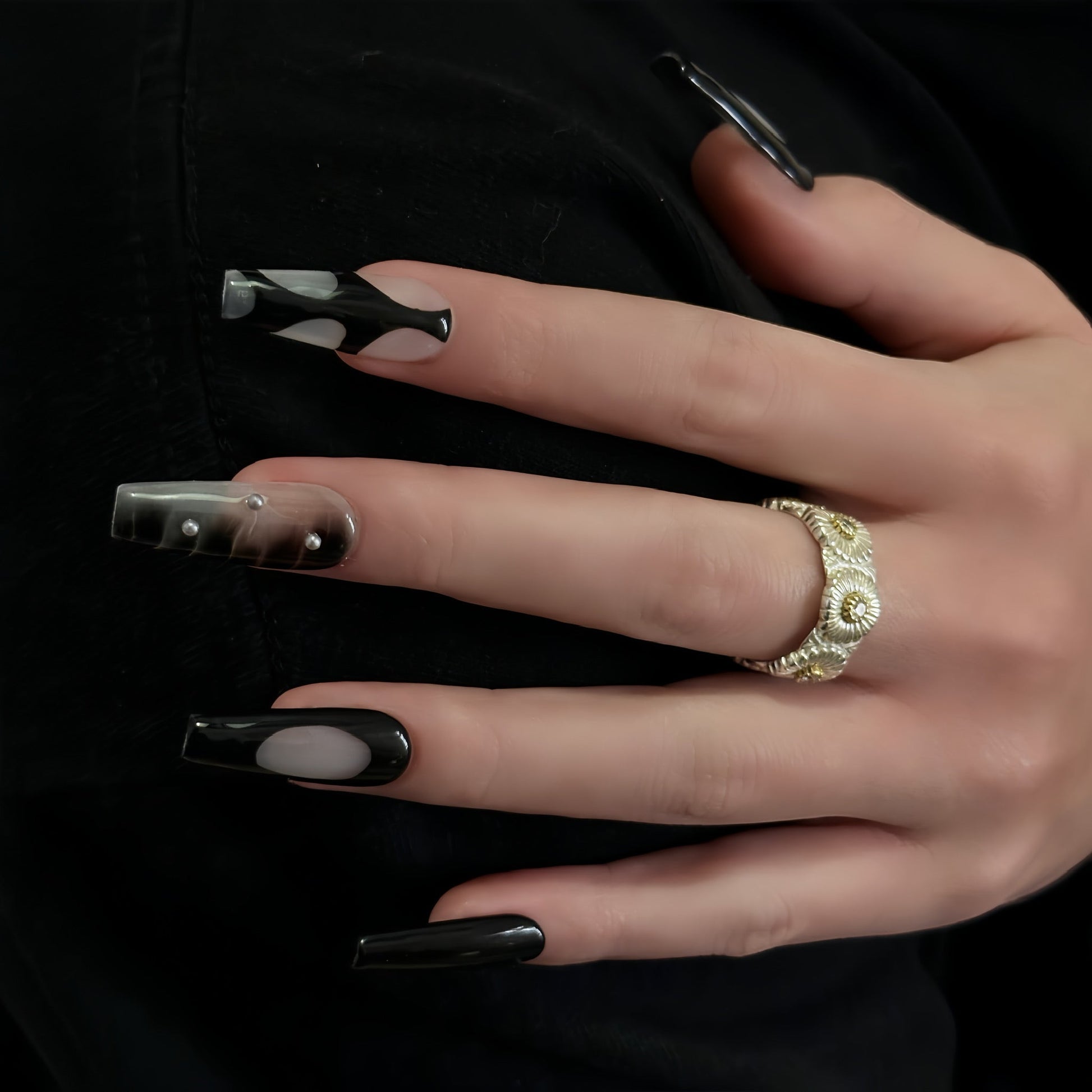 A sophisticated blend of black, white, and mix tones, this press-on nail set offers a modern take on elegance. Featuring marble swirls, sleek patterns, and pearl embellishments, these nails are perfect for making a bold yet refined statement.