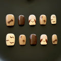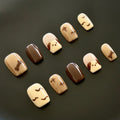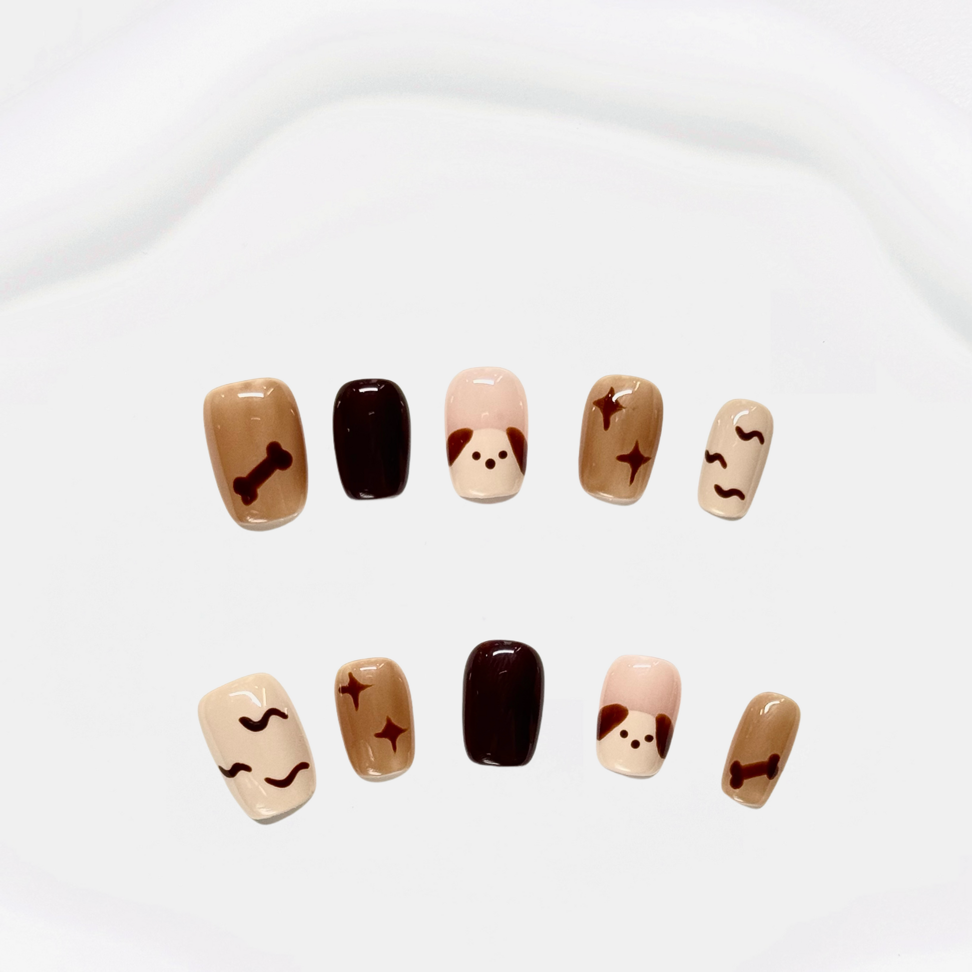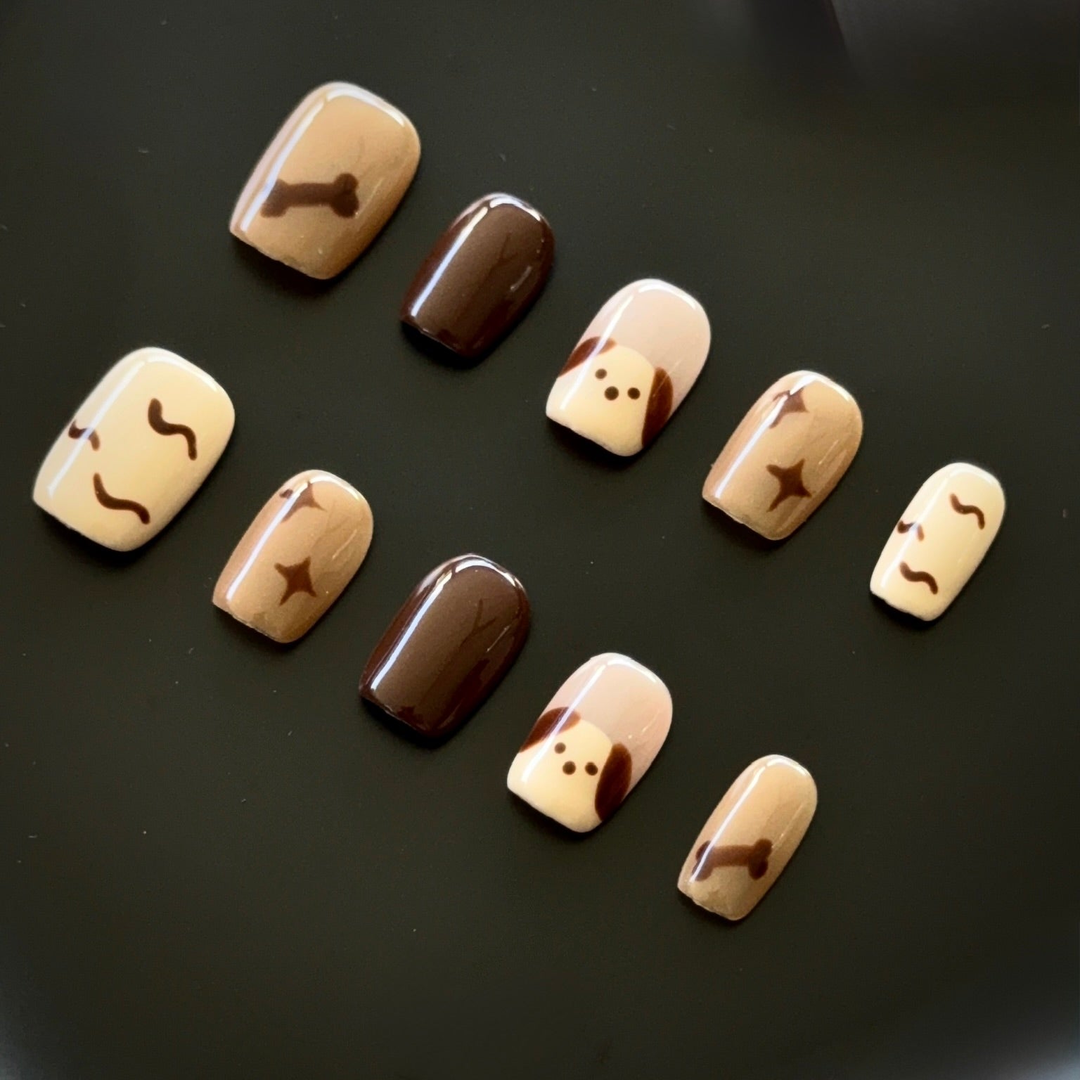 This press-on nail set showcases a warm earthy palette with adorable dog motifs, bones, and stars, capturing the playful and heartwarming essence of pets. The mix of beige and brown tones adds depth and charm, making it perfect for casual wear. Made with eco-friendly, reusable materials, it’s a sustainable way to stay stylish.