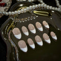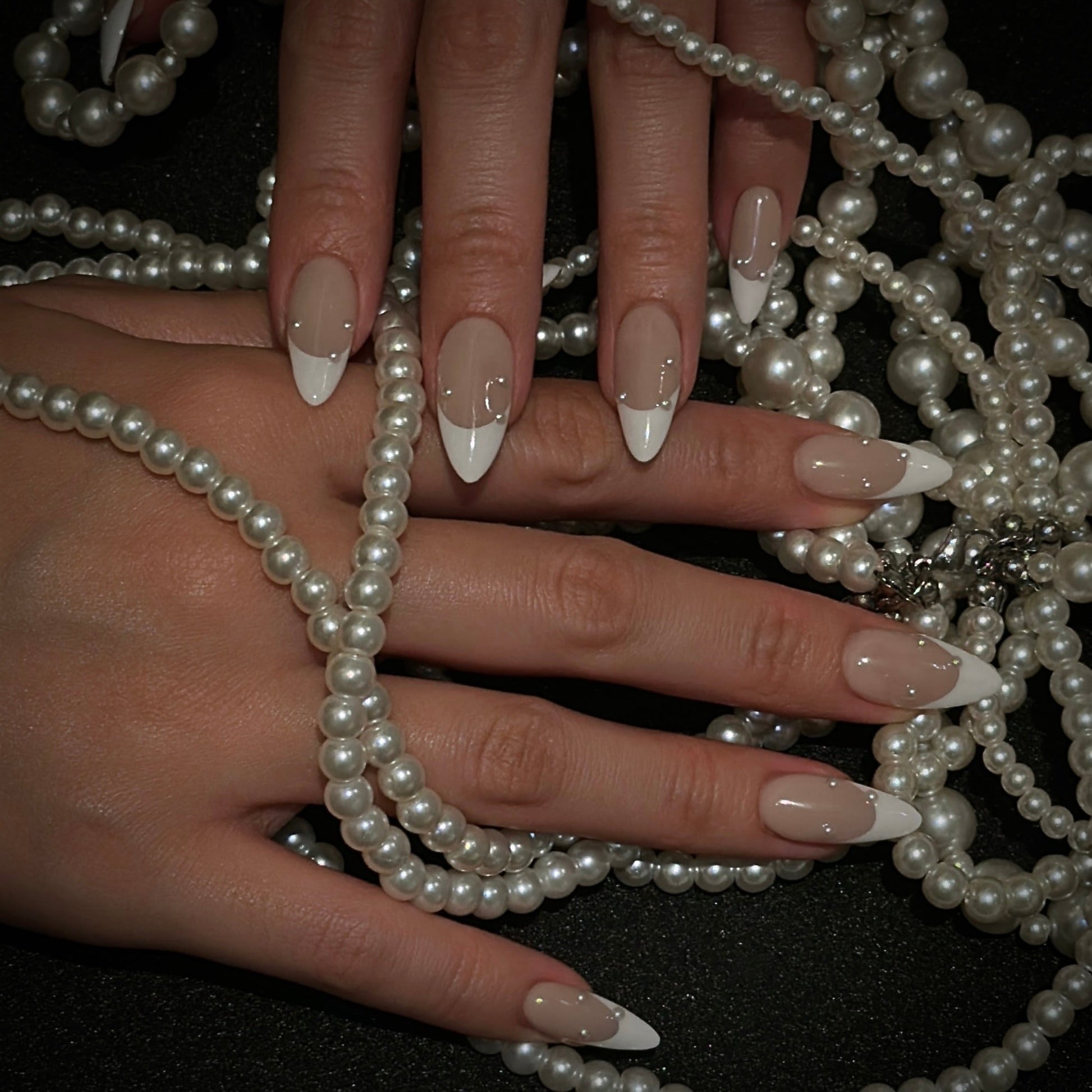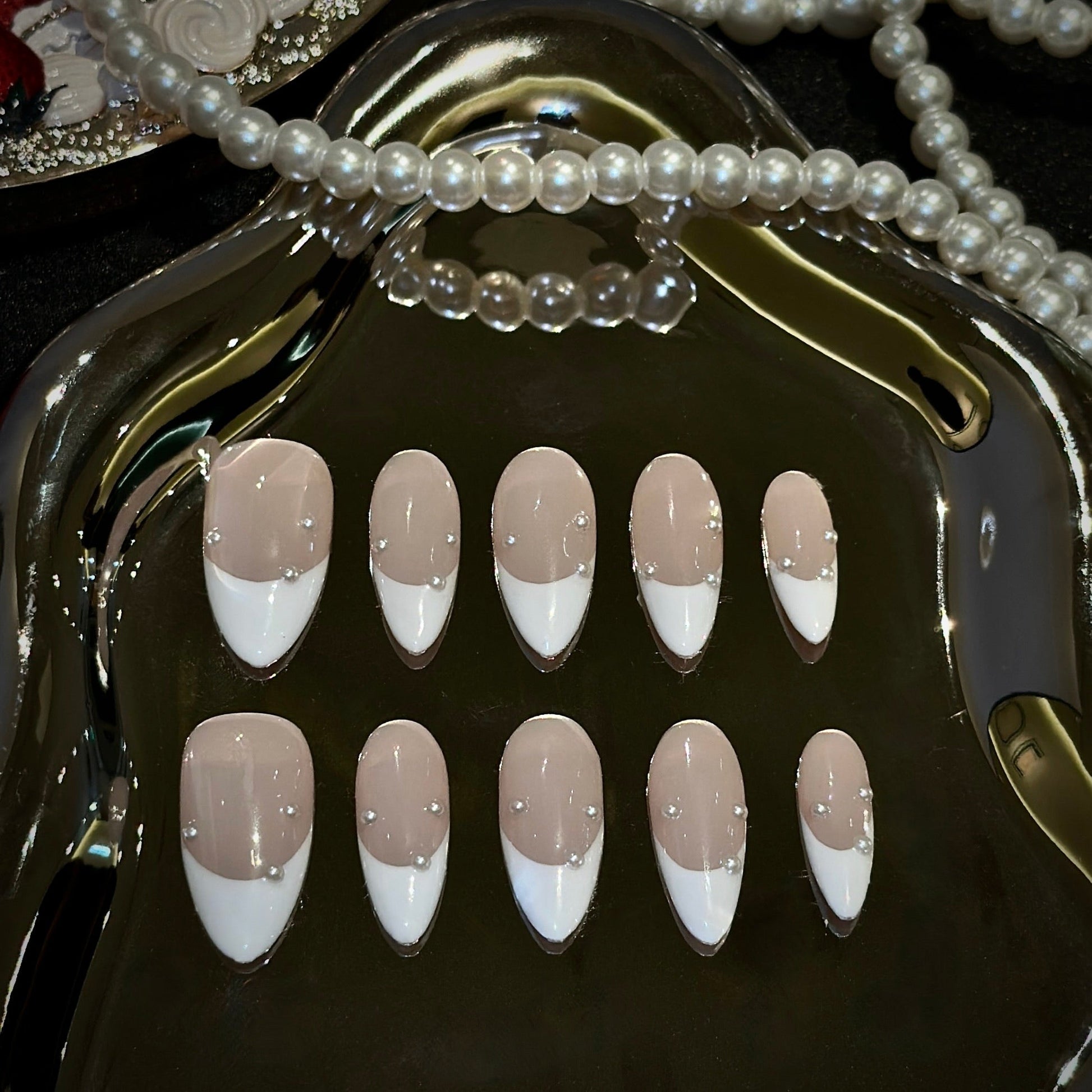 Elevate your style with Pearl Elegance press-on nails. Featuring classic white French tips, subtle nude tones, and dainty pearl-like rhinestones, these nails exude timeless sophistication for every occasion.