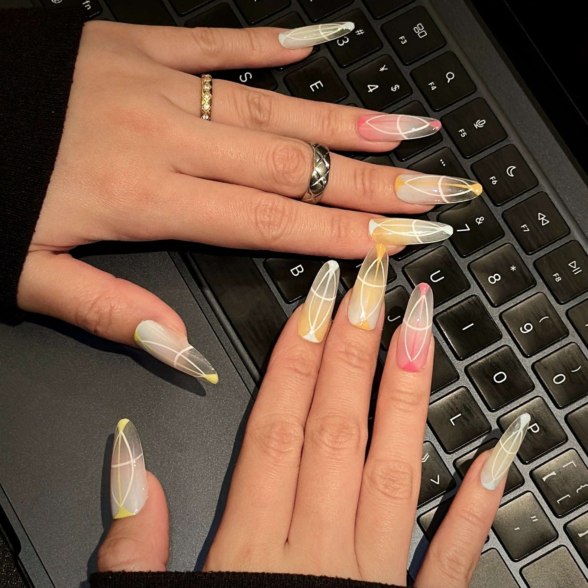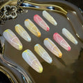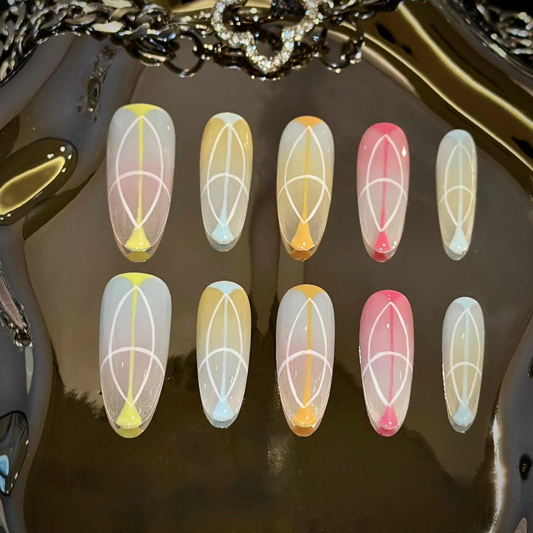 “Prism Glow” captures the essence of playful sophistication with its pastel gradient designs framed by clean white geometric lines. This vibrant press-on nail set exudes elegance with a touch of modern flair, perfect for any occasion.