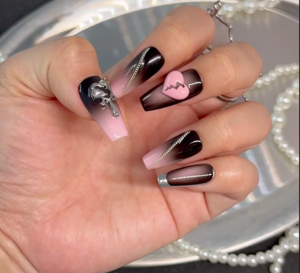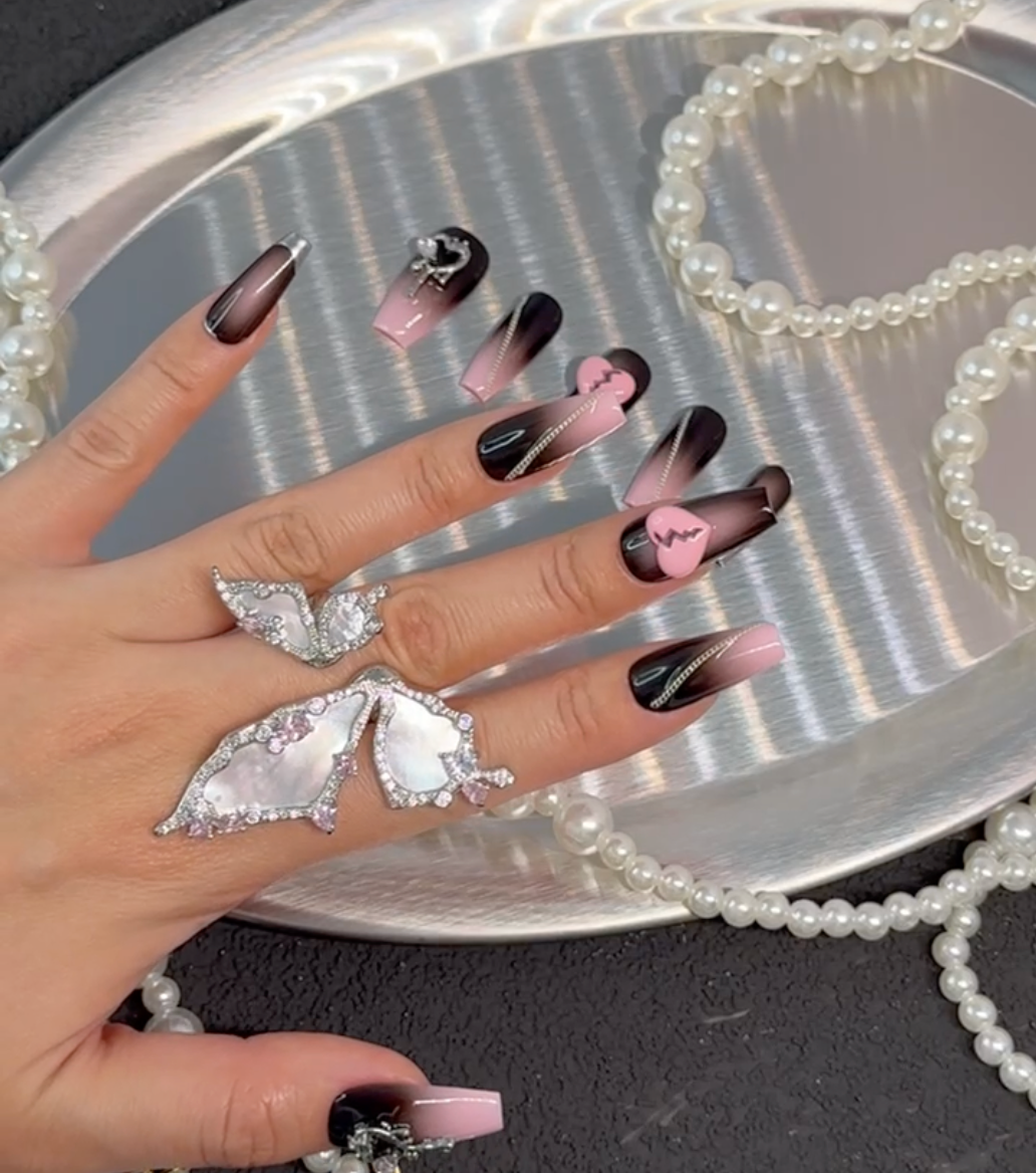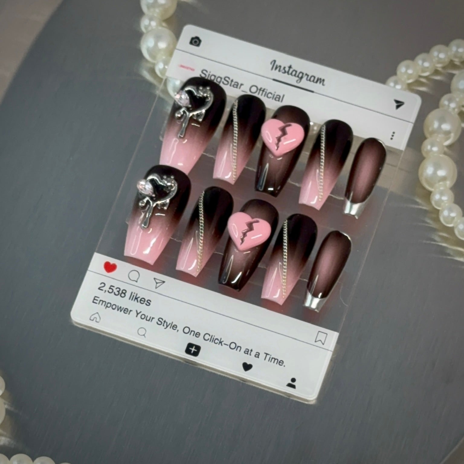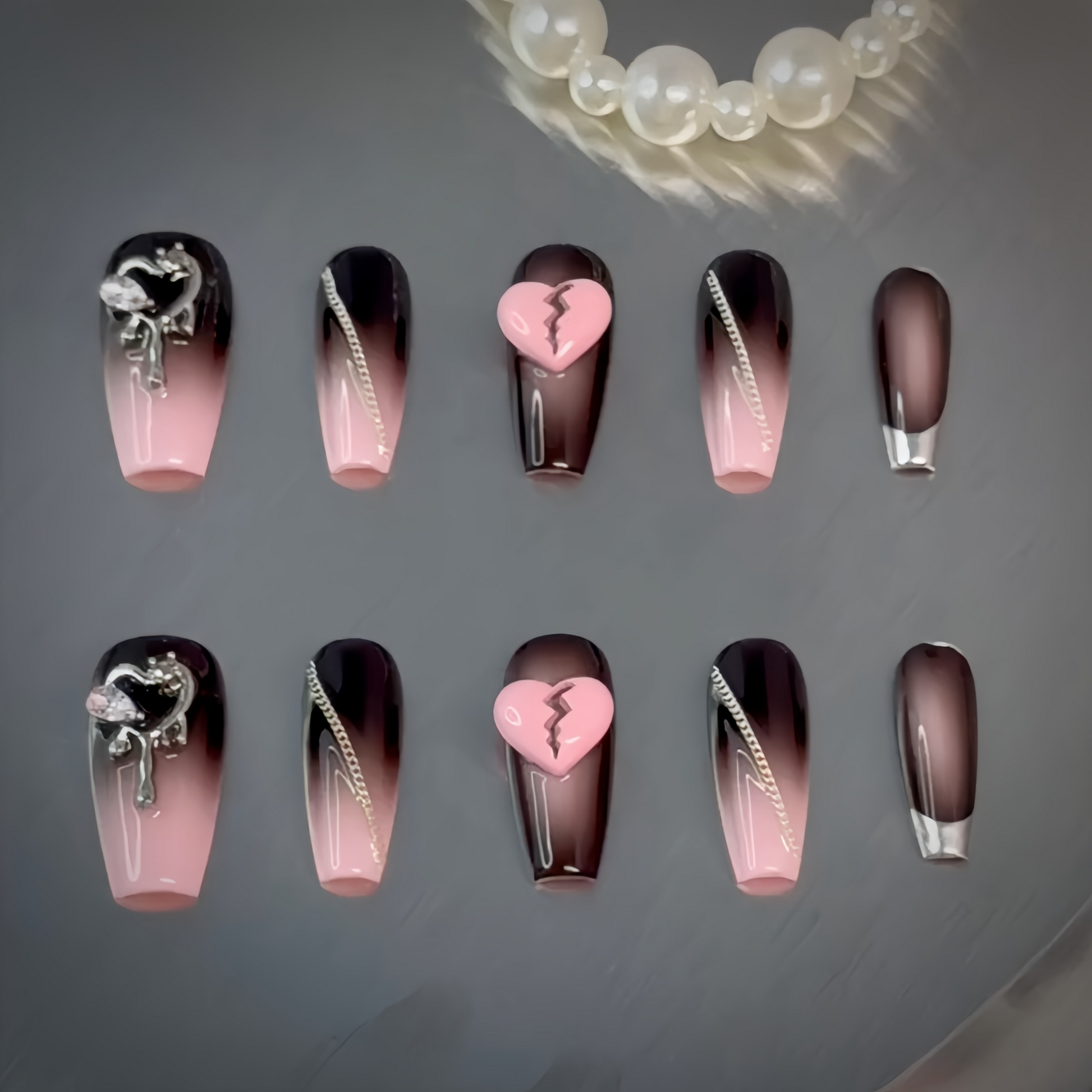 Express your unique style with our Romantic Edge Nail Art Set! This captivating collection features a stunning gradient of deep black and soft pink, beautifully complemented by playful embellishments. Each nail showcases intricate designs, including heart motifs and delicate chains, adding a touch of edgy romance to your look. Perfect for making a statement on any occasion, these press-on nails are easy to apply, allowing you to embrace your individuality effortlessly.