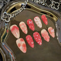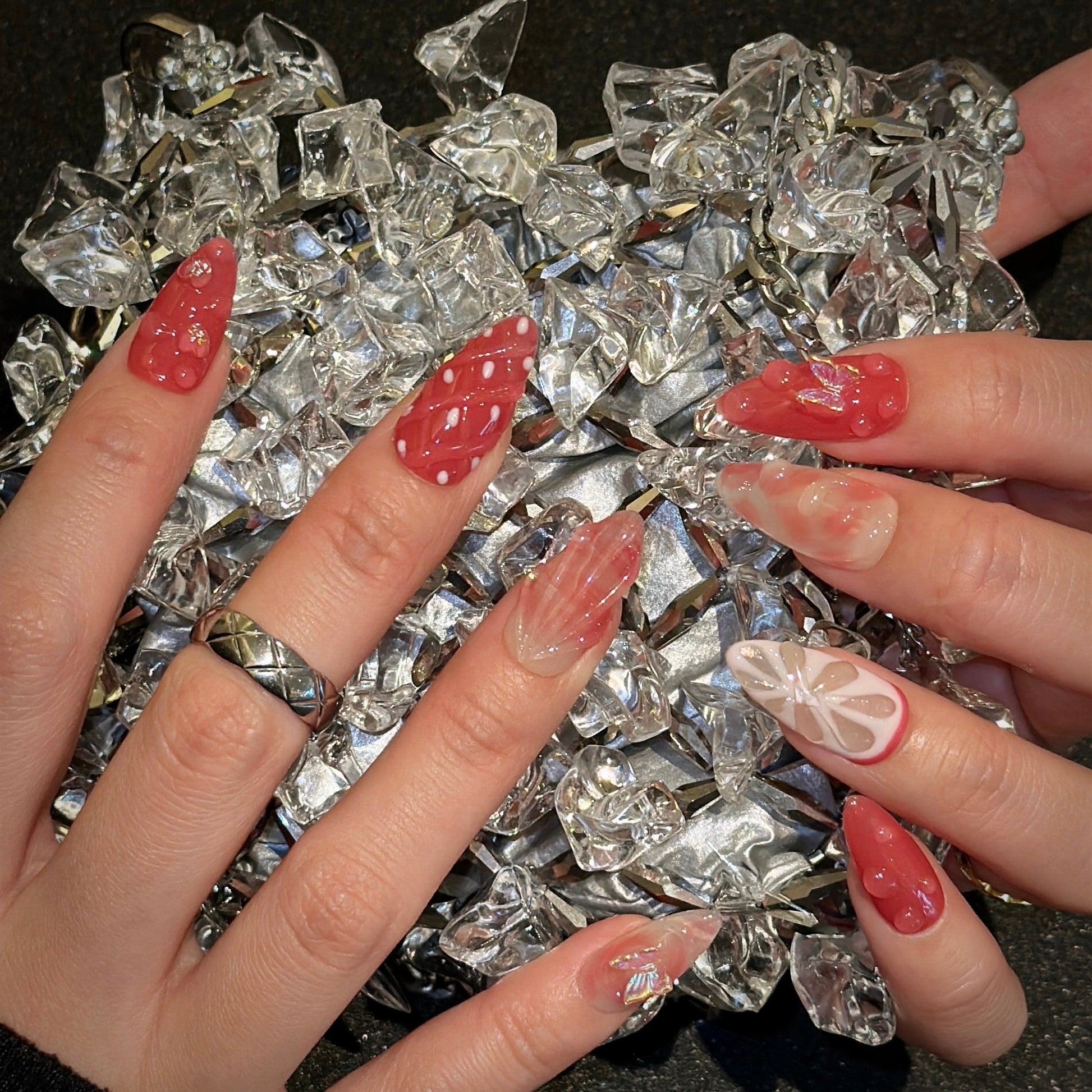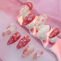 Candy Doll Nail Art features red and pink as the main colors, creating a romantic and sweet atmosphere. The nail art has abundant decorative elements, including delicate butterfly decorations, cute round protrusions, and fine pattern designs. These elements match each other, making each nail like a small piece of art. The color transition of the nail art is natural and the texture is rich, enabling your hands to exude charming feminine charm with every gesture. It is suitable for romantic occasions such as dates and weddings.