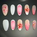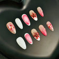 A captivating blend of soft blush and deep crimson, this handcrafted press-on nail set features intricate floral 3D accents, delicate gold embellishments, and elegant gradient tones. The artistic combination of translucent and opaque finishes adds depth and sophistication, making it perfect for any elegant occasion.