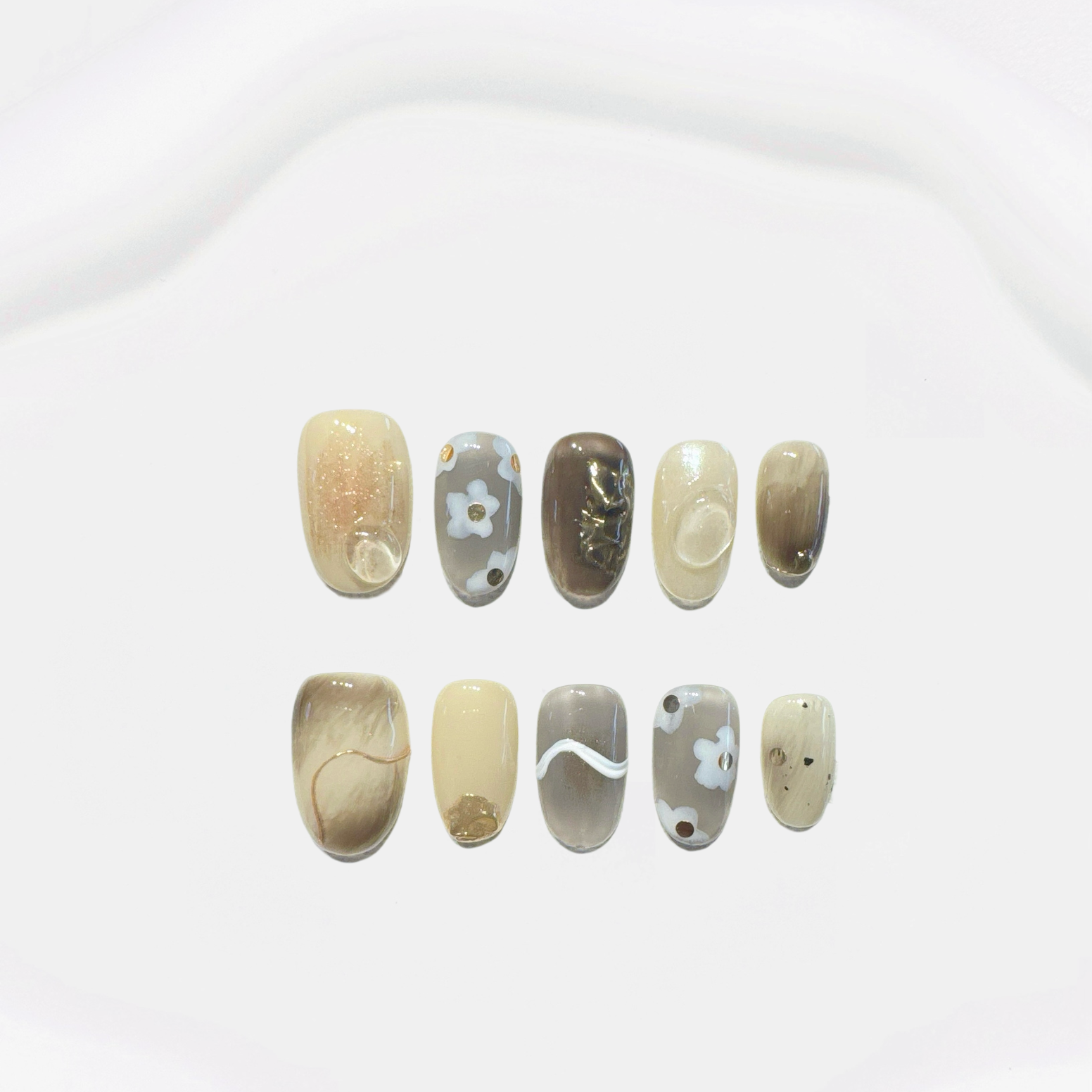 This press-on nail set combines natural charm with elegance, featuring warm earthy tones accented by hand-painted white florals and metallic details. The soft gradient designs and subtle shimmer create a perfect balance of freshness and sophistication. Made with eco-friendly, reusable materials, it offers a sustainable way to embrace timeless beauty.