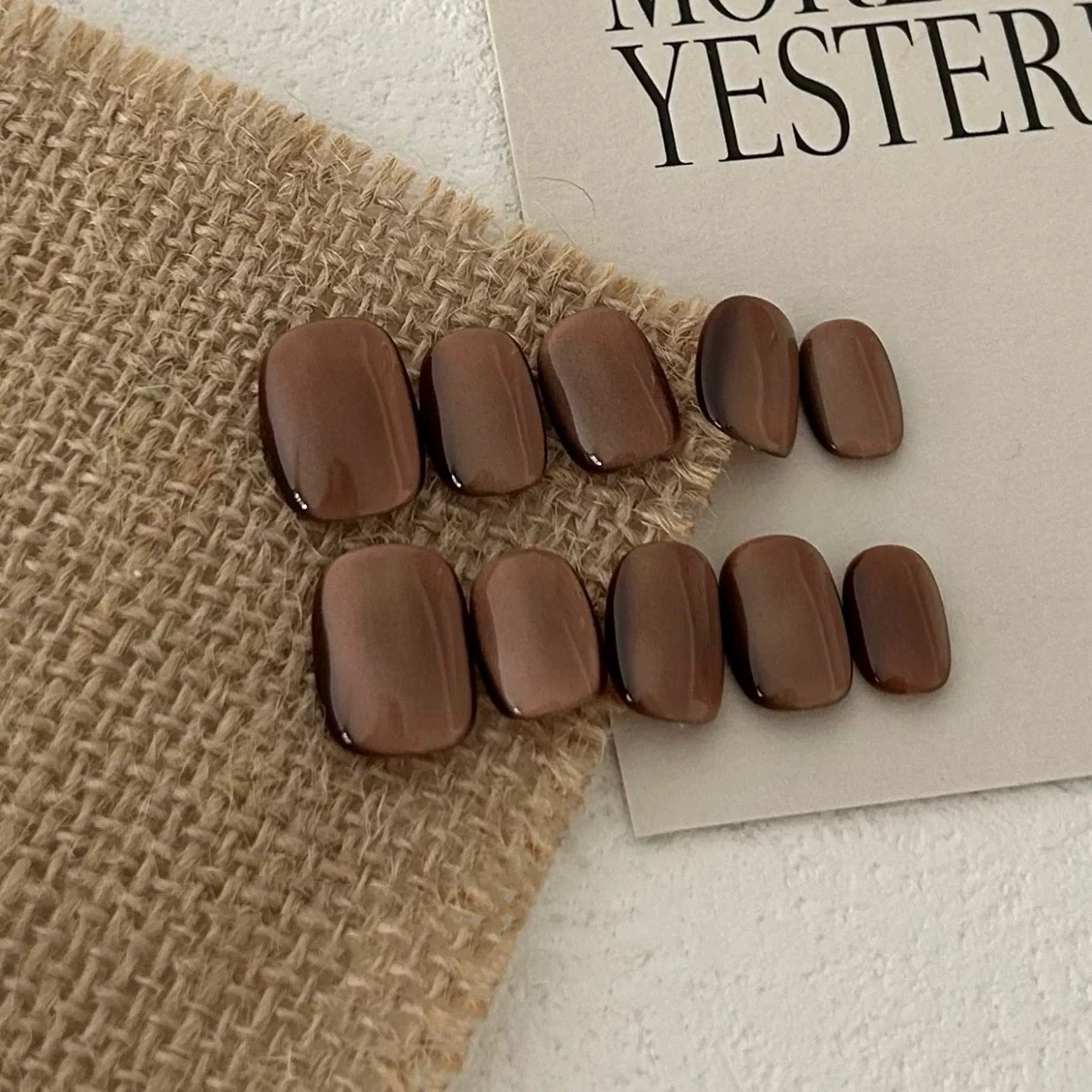 This press-on nail set showcases a deep coffee hue with a silky, glossy finish, exuding understated elegance. The minimalist yet refined design is perfect for daily wear or special occasions, adding a touch of sophistication to your look. Crafted with eco-friendly, reusable materials, it’s a sustainable choice for timeless beauty.