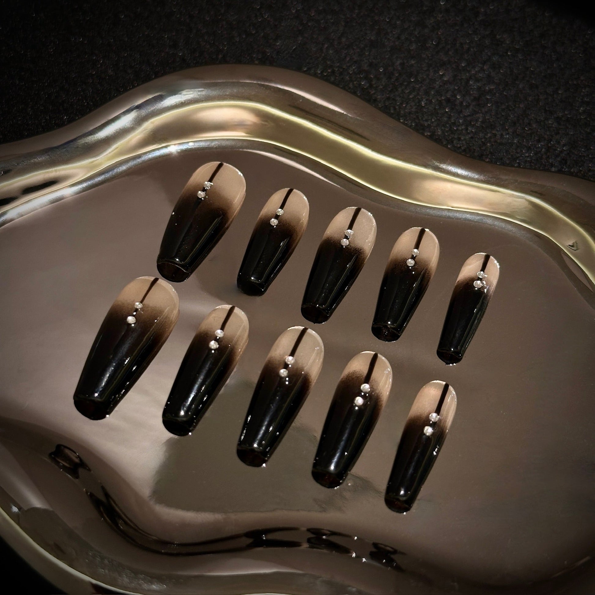 Elevate your nail game with Smoky Glam, a stunning gradient design blending deep black and bronze hues. Accented with delicate rhinestones, this press-on set embodies effortless sophistication and elegance. Perfect for evening wear or anytime you want to shine.