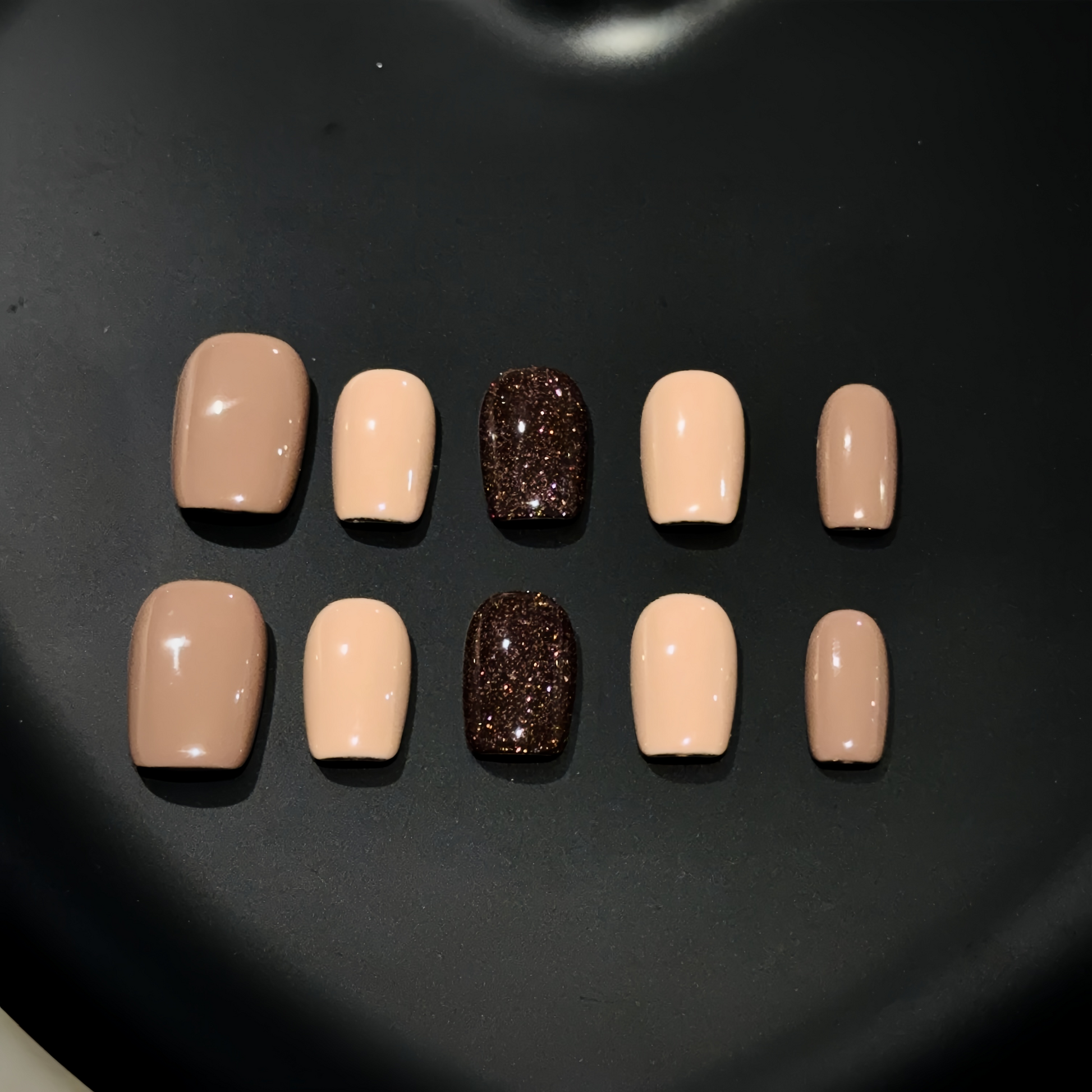(undersize)This press-on nail set showcases a timeless nude palette accented with a shimmering deep brown glitter nail, blending understated elegance with a touch of luxury. Perfect for any occasion, from casual wear to formal events, these nails enhance your overall style. Crafted with eco-friendly, reusable materials, they are a sustainable choice for beauty enthusiasts.